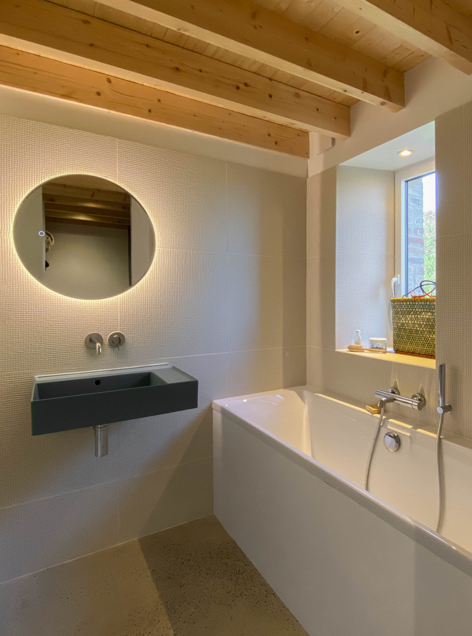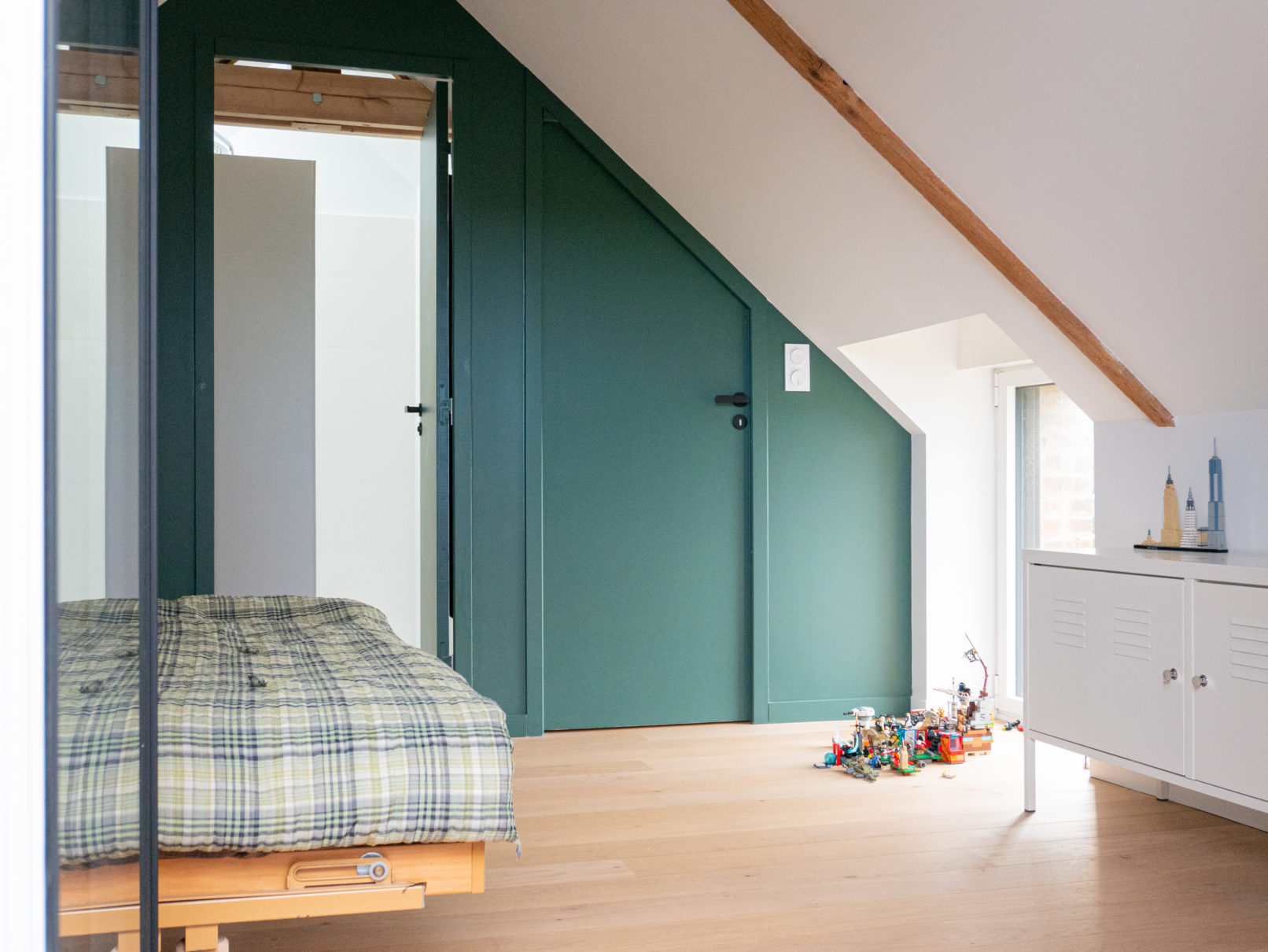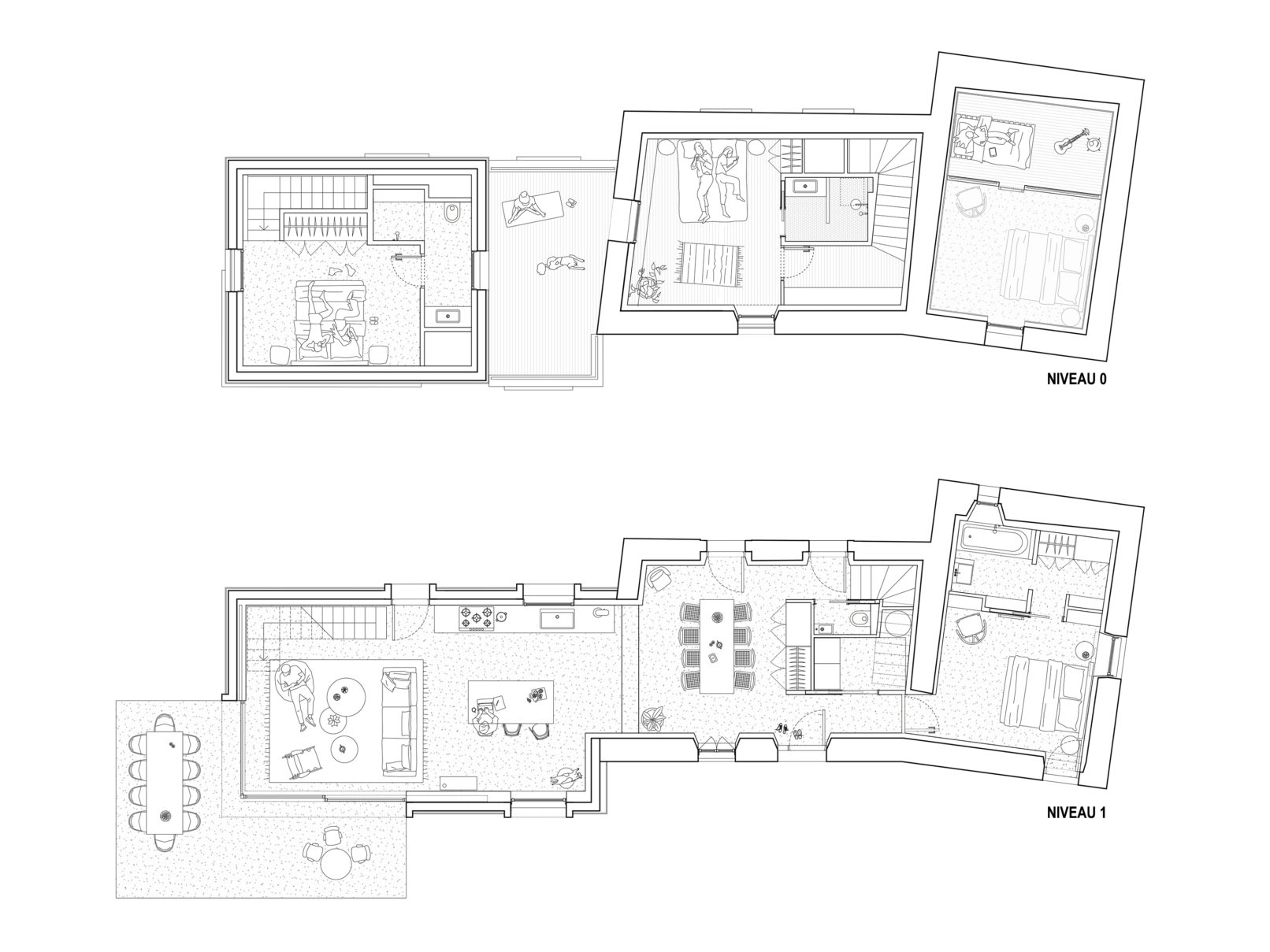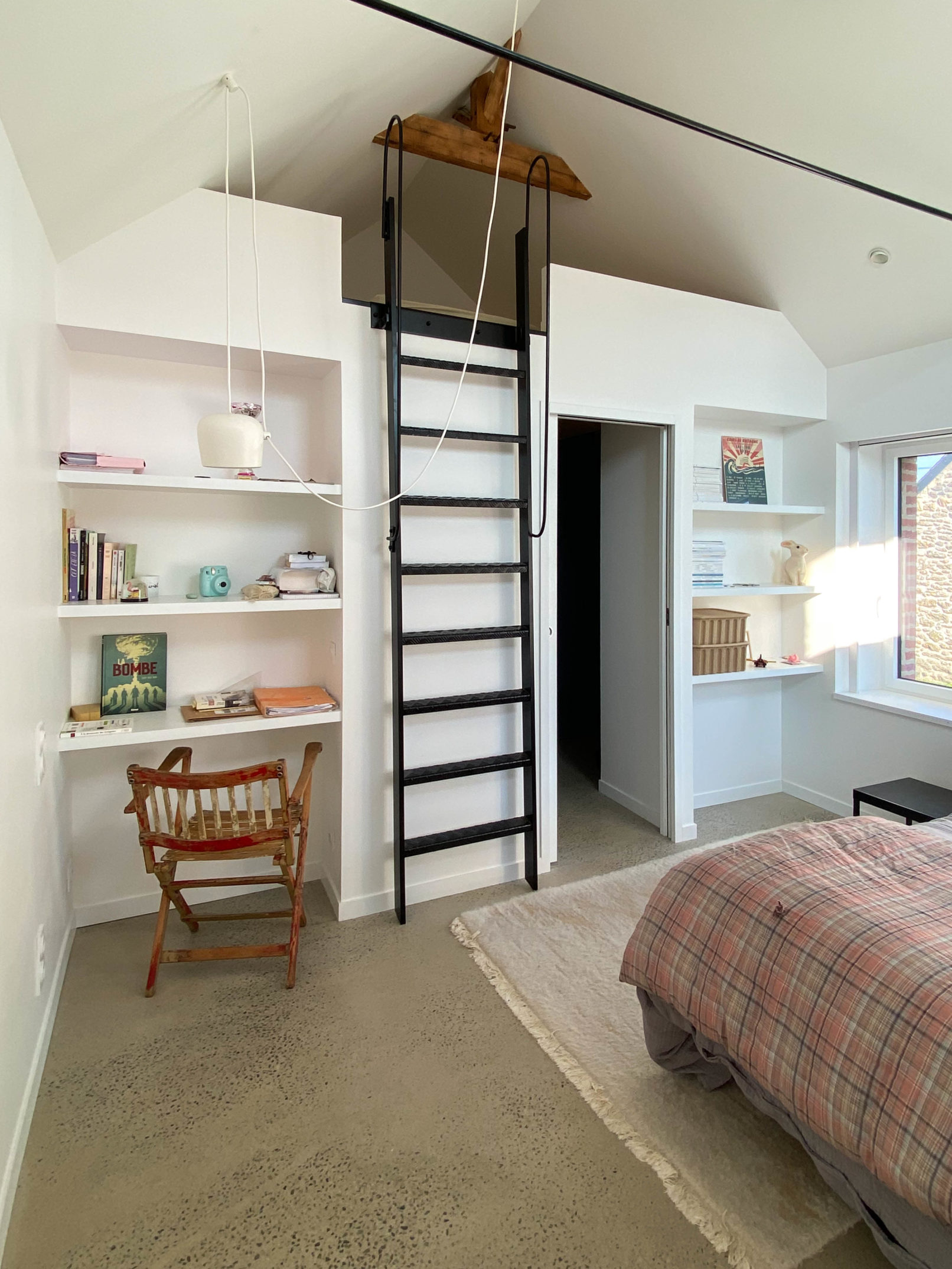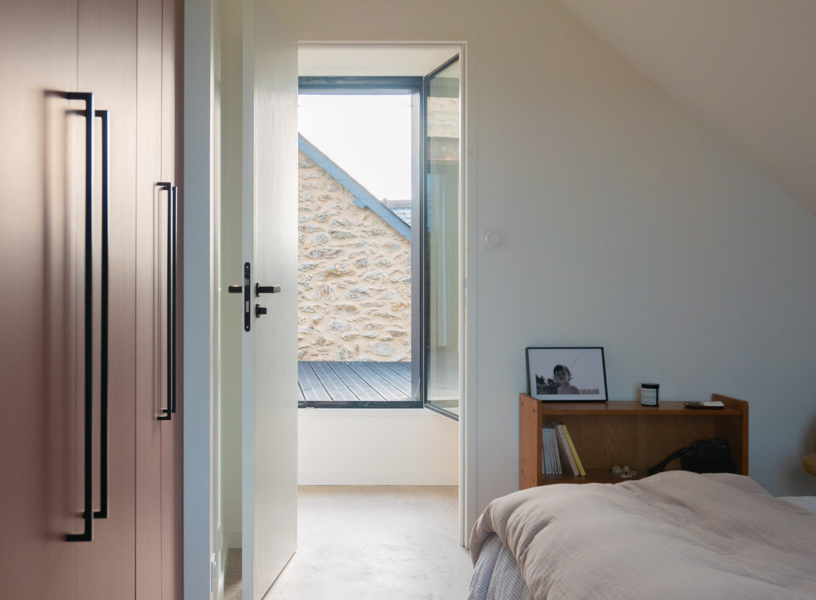 Soucieux des problèmes d’éclairement dans ces maisons anciennes, le séjour occupe le corps principal et l’extension qui vient complètement s’ouvrir en angle, baignant largement de lumière la pièce de vie principale, et laissant la façade sur un porte à faux une fois les baies à galandages ouvertes. La façade nord de la partie ancienne a été percée par deux ouvertures verticales, encadrées de briques anciennes, comme si elles avaient toujours existées. Les espaces techniques sont au centre de la maison, noyau autour duquel on tourne pour accéder à deux chambres. On en compte d’ailleurs 3, chacune avec leur propre accès et leur salle de bain. Deux sont situées dans la partie ancienne, une au RDC et une qui occupe tout le comble. La troisième se situe à l ‘étage de l’extension. Les deux chambre de l’étagecommuniquent par la toiture terrasse, offrant un bain de soleil sous les branches du pommier voisin, et une jolie vue sur la campagne environnante.