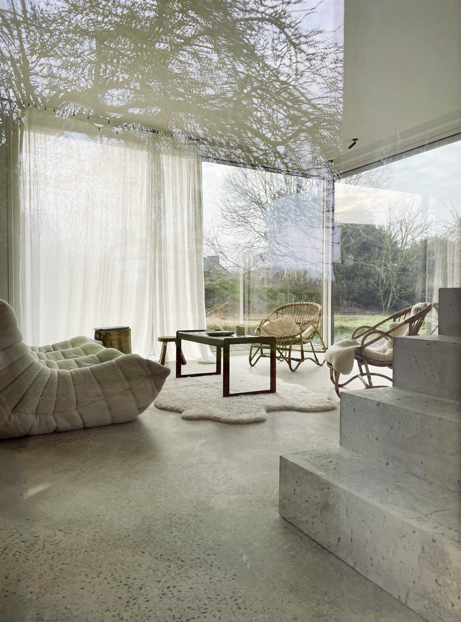 La maison est située en zone NH, c’est à dire une zone naturelle préservée, avec une évolution restreinte des constructions existantes, en plus d’être soumise à la loi littoral. Interdit de surélever la maison et très limité pour étendre le bâtiment, il a fallu composer avec les volumes existants.