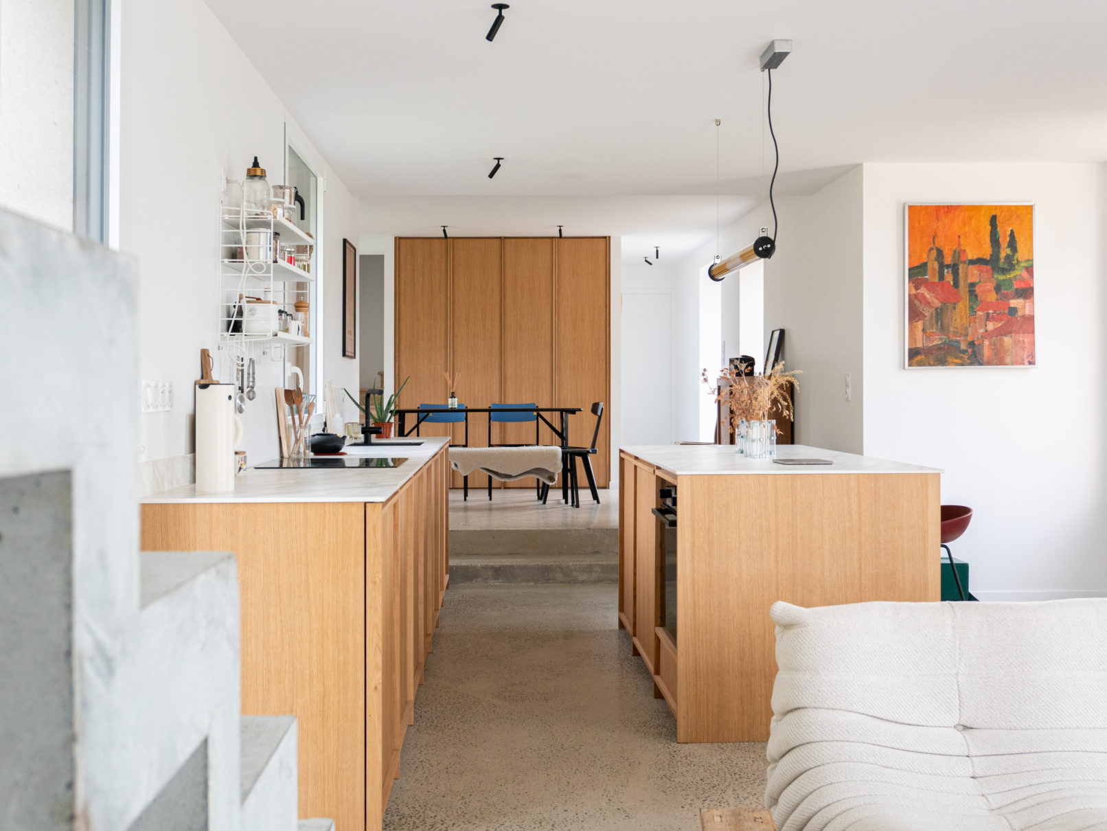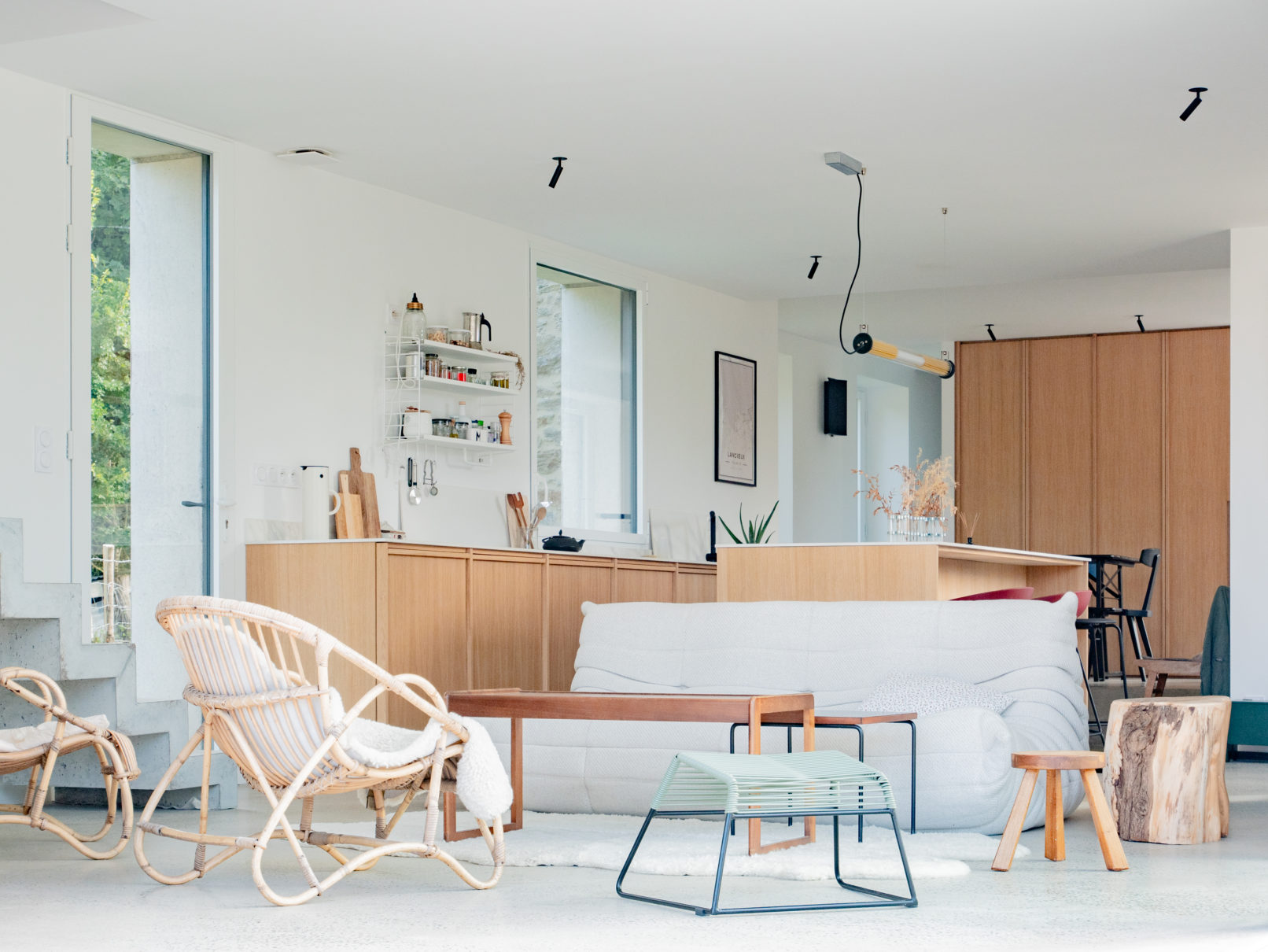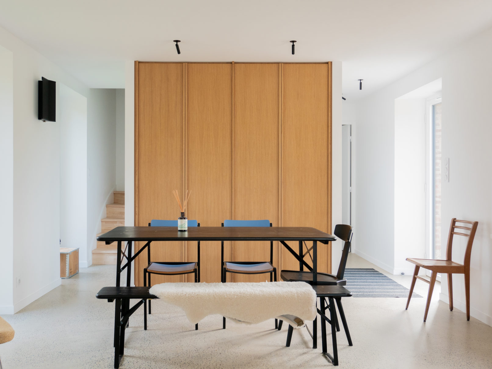 Les matériaux privilégiés sont des matériaux simples, bruts : le béton et le bois. Tout le rez-de-chaussée et l’étage de l’extension sont recouverts d’une dalle de béton poncée, pied de nez économique au terrazzo. L’escalier de l’extension est également en béton. Coulé sur le chantier dans des coffrages à même le sol, il a ensuite été levé et assemblé. Le bois est présent dans les agencements, majoritairement en chêne clair, pour apporter de la chaleur à l’ensemble. Ils ont tous été dessinés sur mesure.