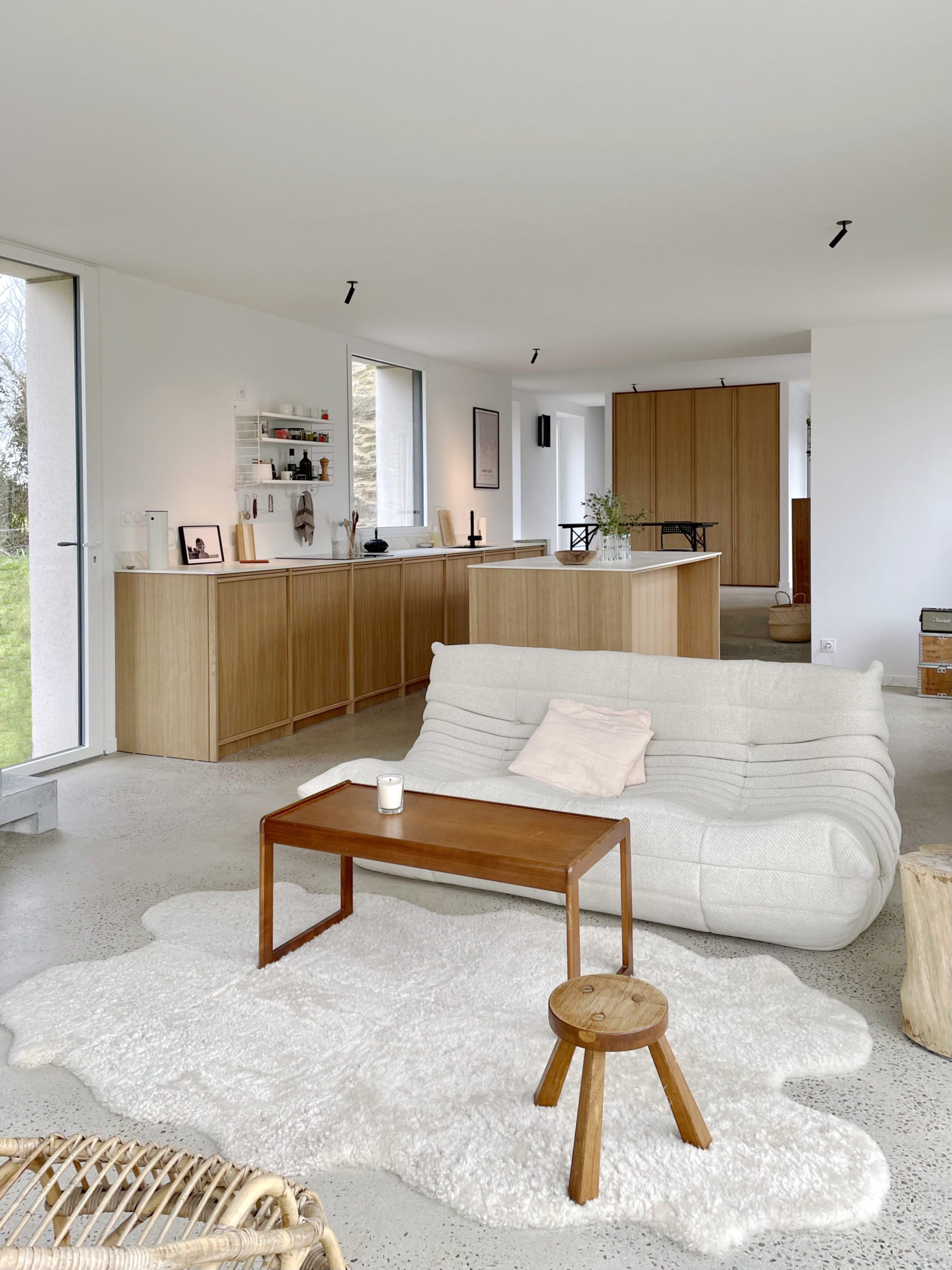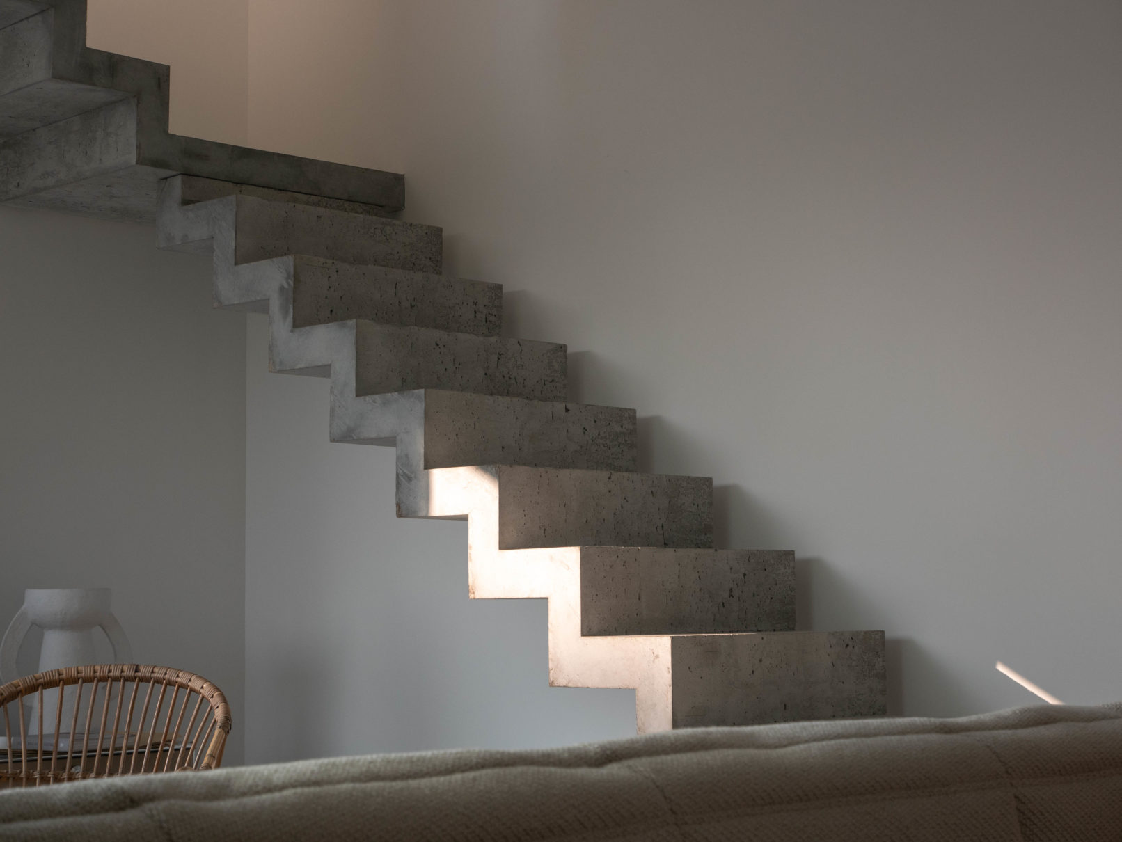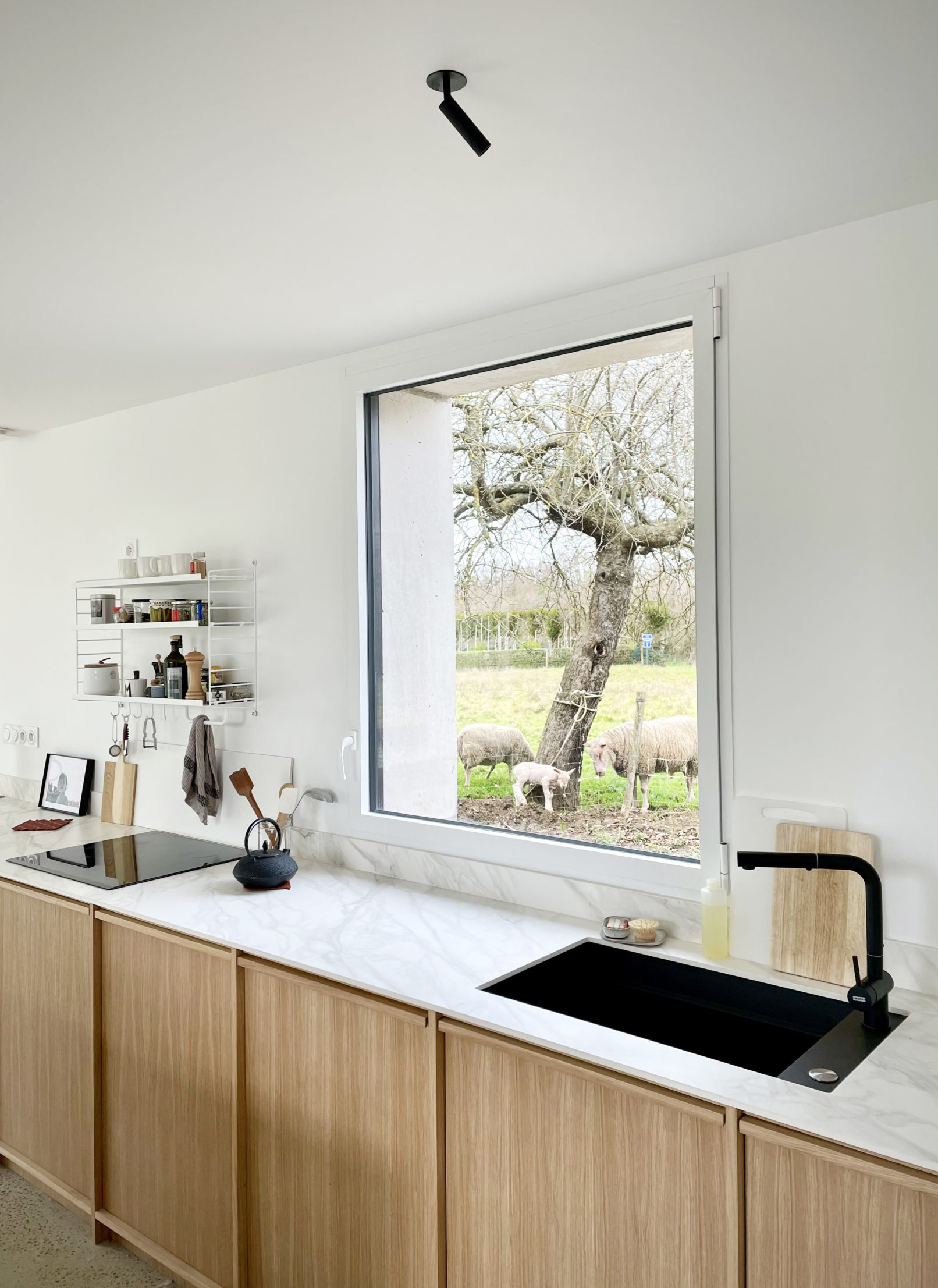 Les matériaux privilégiés sont des matériaux simples, bruts : le béton et le bois. Tout le rez-de-chaussée et l’étage de l’extension sont recouverts d’une dalle de béton poncée, pied de nez économique au terrazzo. L’escalier de l’extension est également en béton. Coulé sur le chantier dans des coffrages à même le sol, il a ensuite été levé et assemblé. Le bois est présent dans les agencements, majoritairement en chêne clair, pour apporter de la chaleur à l’ensemble. Ils ont tous été dessinés sur mesure.