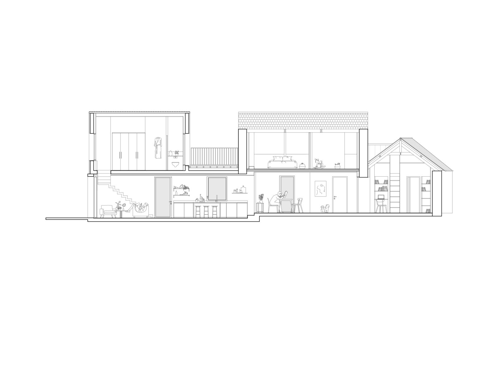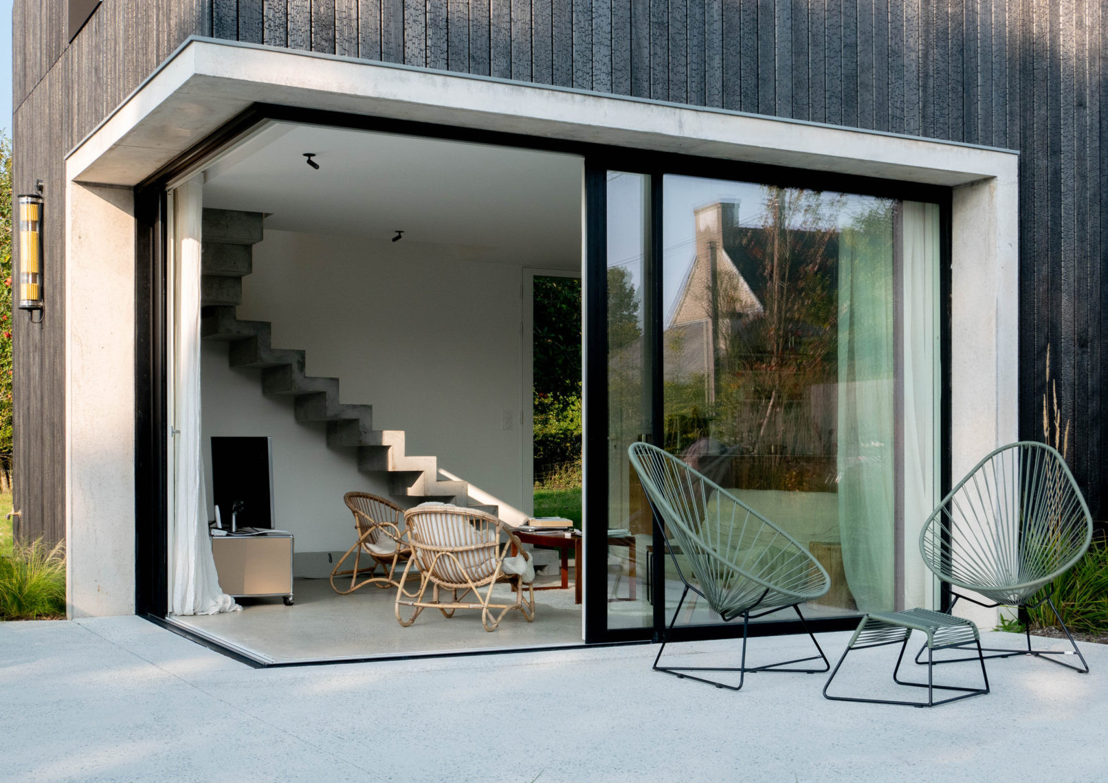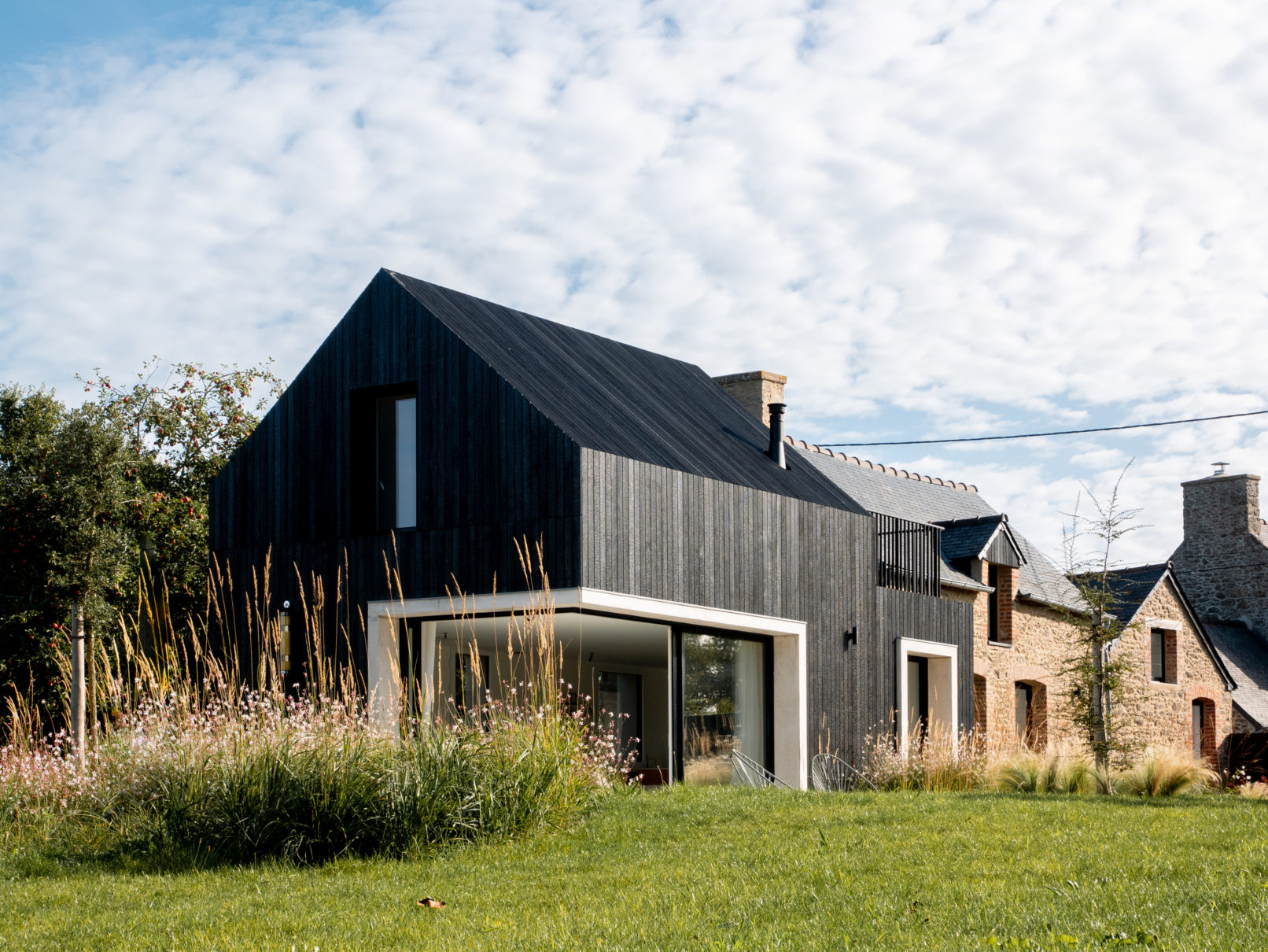L’extension reprend les volumes de la maison existante : elle est d’une largeur similaire, les faitages et les égouts s’alignent, les cheminées se répondent. C’est une réinterprétation moderne, avec des matériaux sobres et actuels, et des lignes volontairement épurées. Des cadres en béton, contrastant avec le bois brûlé, viennent faire échos à ceux en brique de l’ancienne bâtisse.