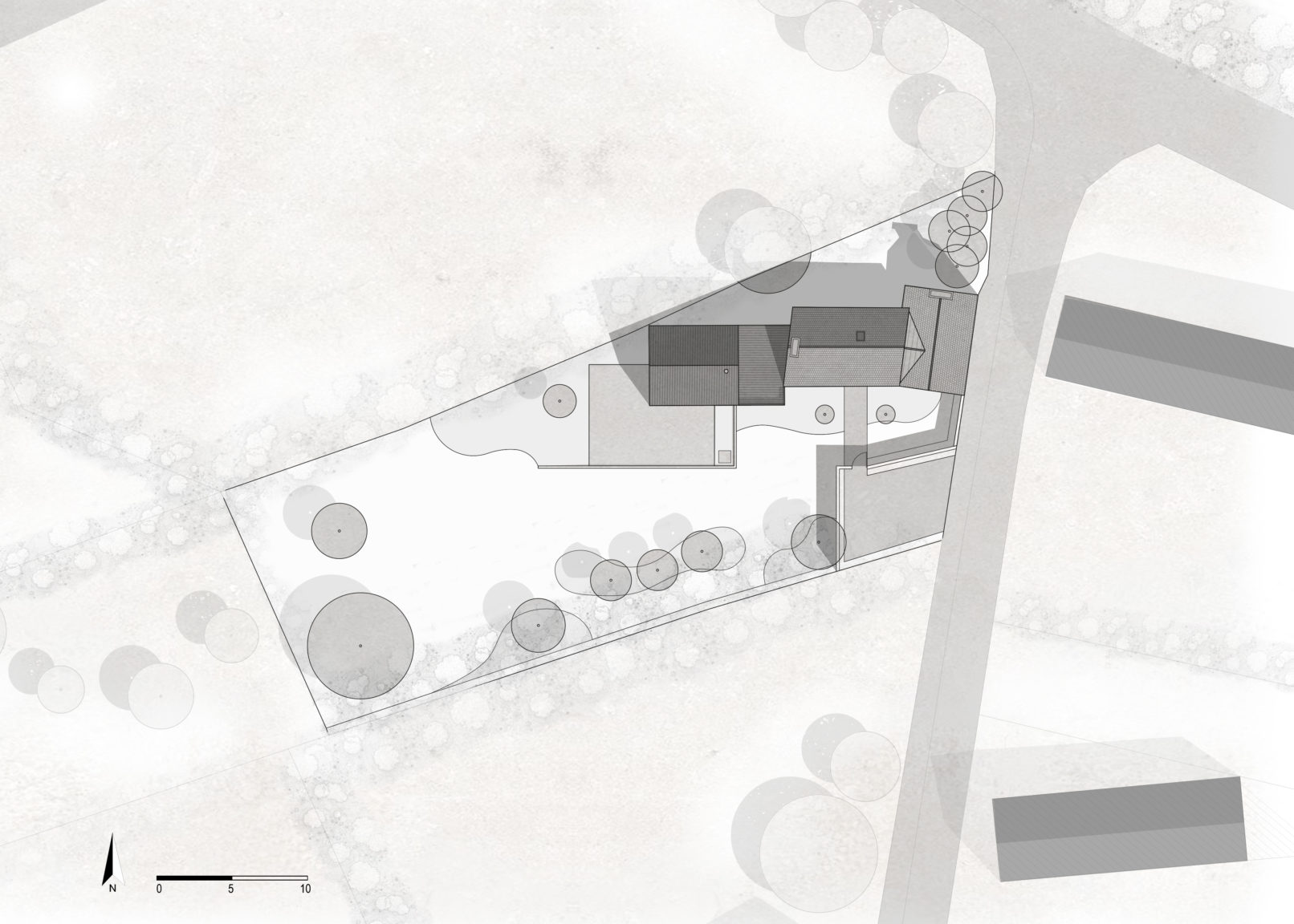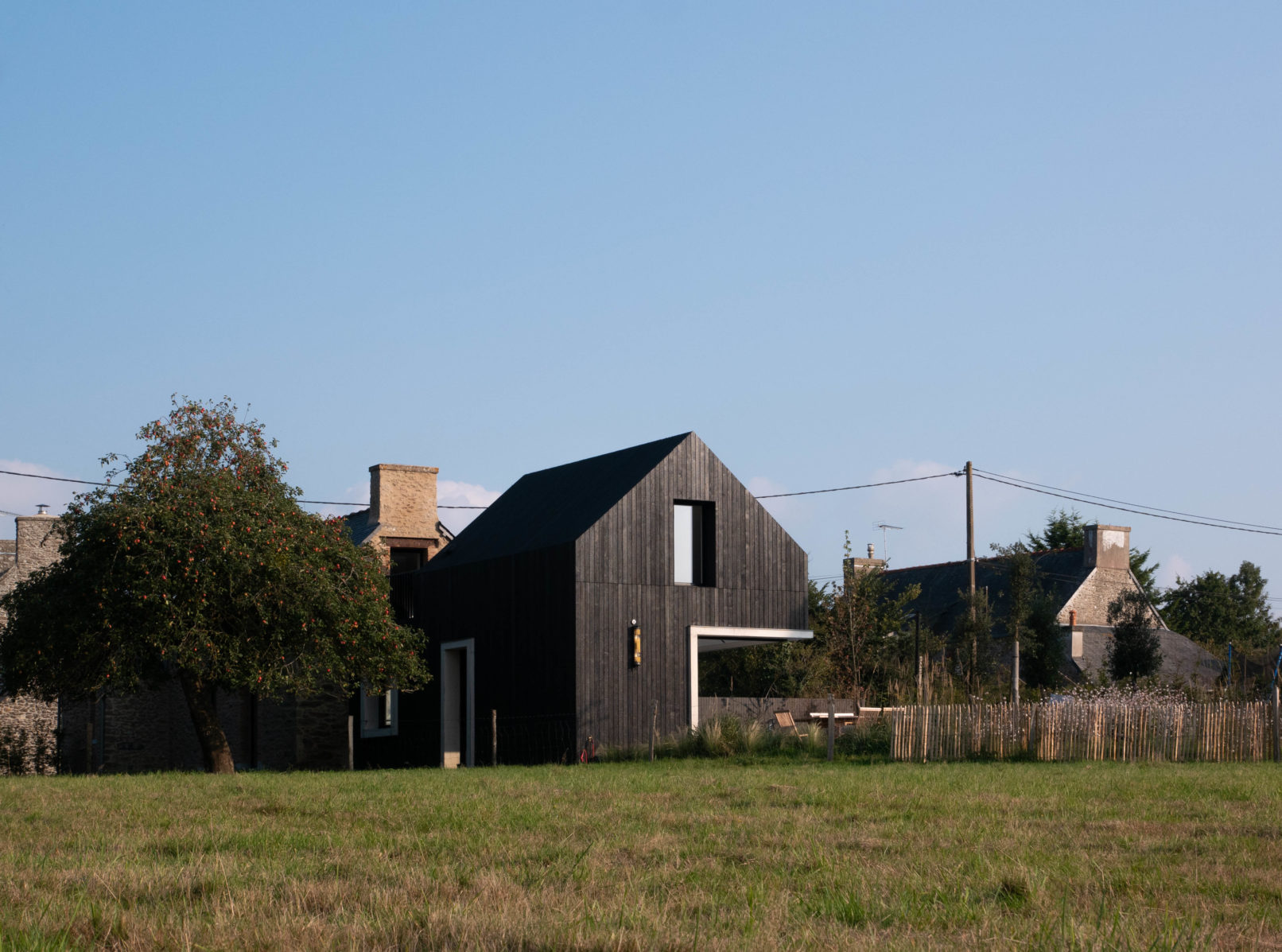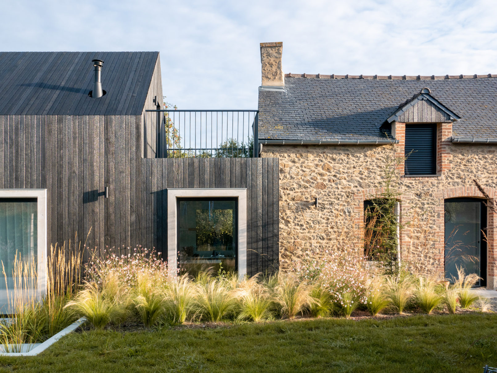 Pour simplifier la lecture de l’extension, celle ci est bardée par un unique matériau en façade et en toiture. Par sa couleur sombre, mais très nuancée avec les craquelures du bois, l’extension se fond dans le paysage, et s’intègre à son environnement. Le travail d’Hugo Campion, paysagiste, vient asseoir avec finesse la maison, dans un écrin végétal sobre et naturel.