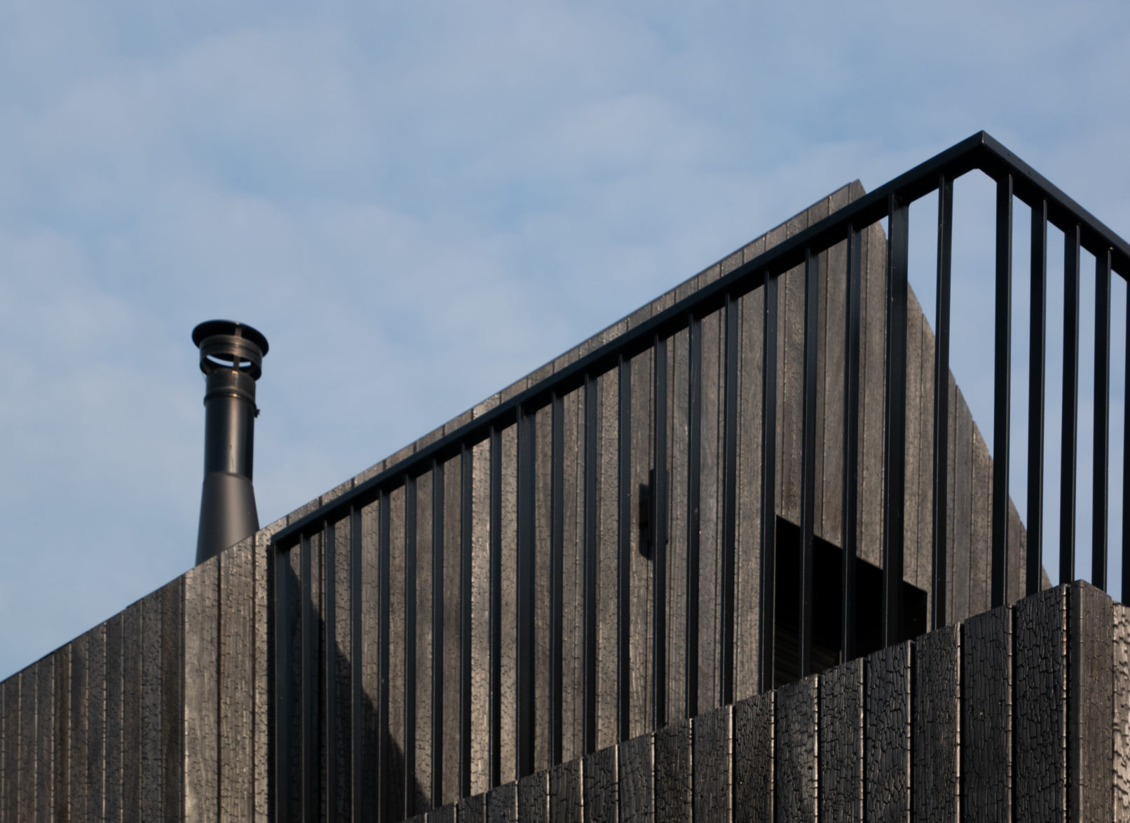 L’extension est alors reliée par l’ancienne annexe, rénovée, coiffée d’une toiture terrasse, élément de jonction entre l’ancienne bâtisse en pierre, et l’extension bardée intégralement de bois brulé.