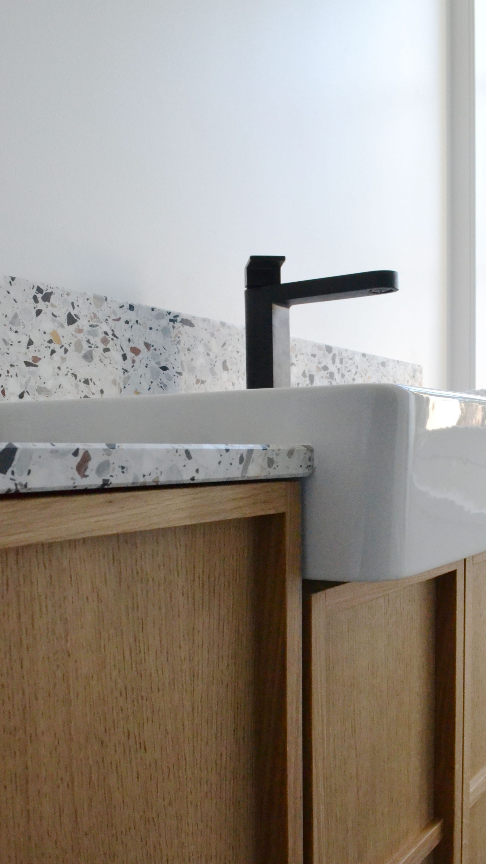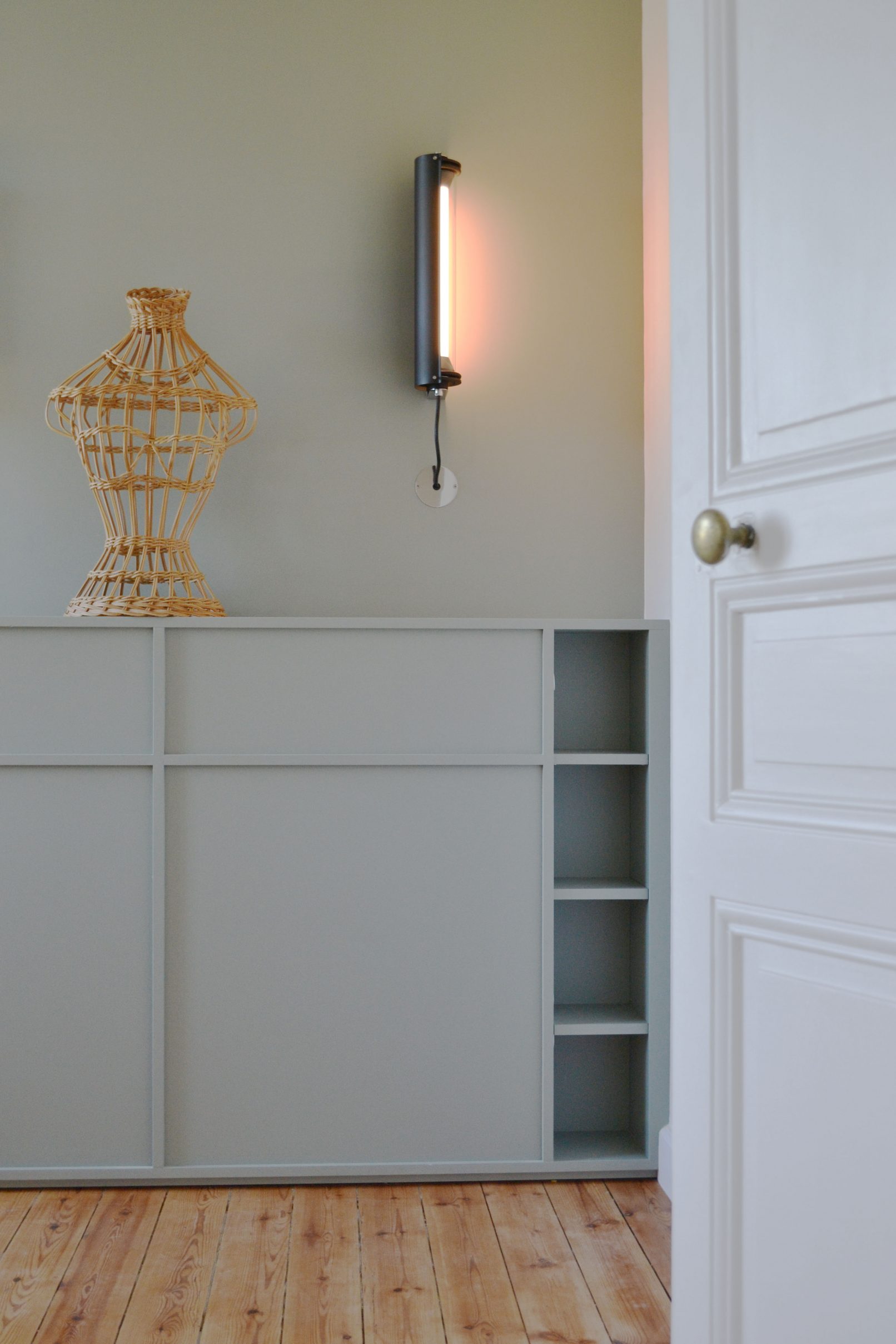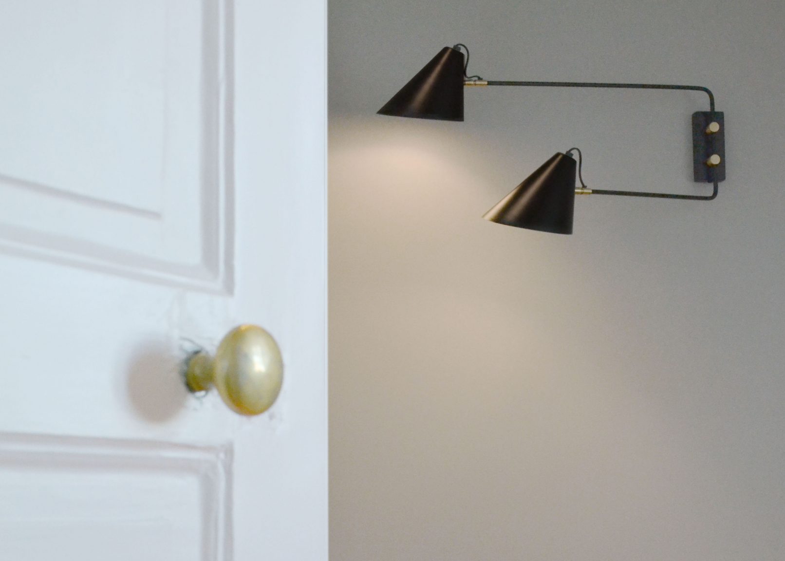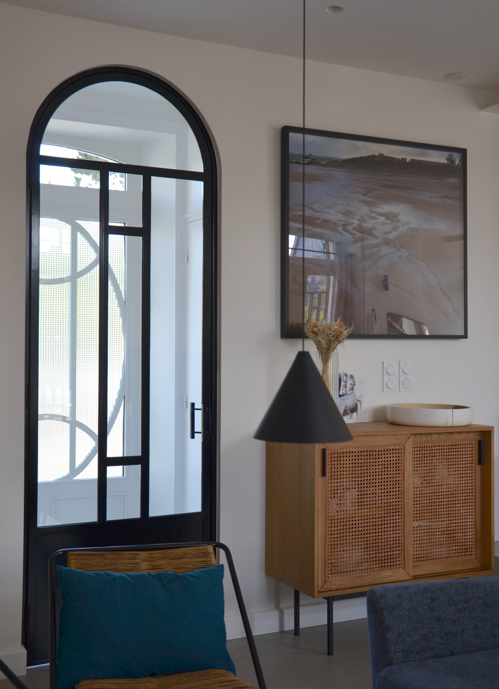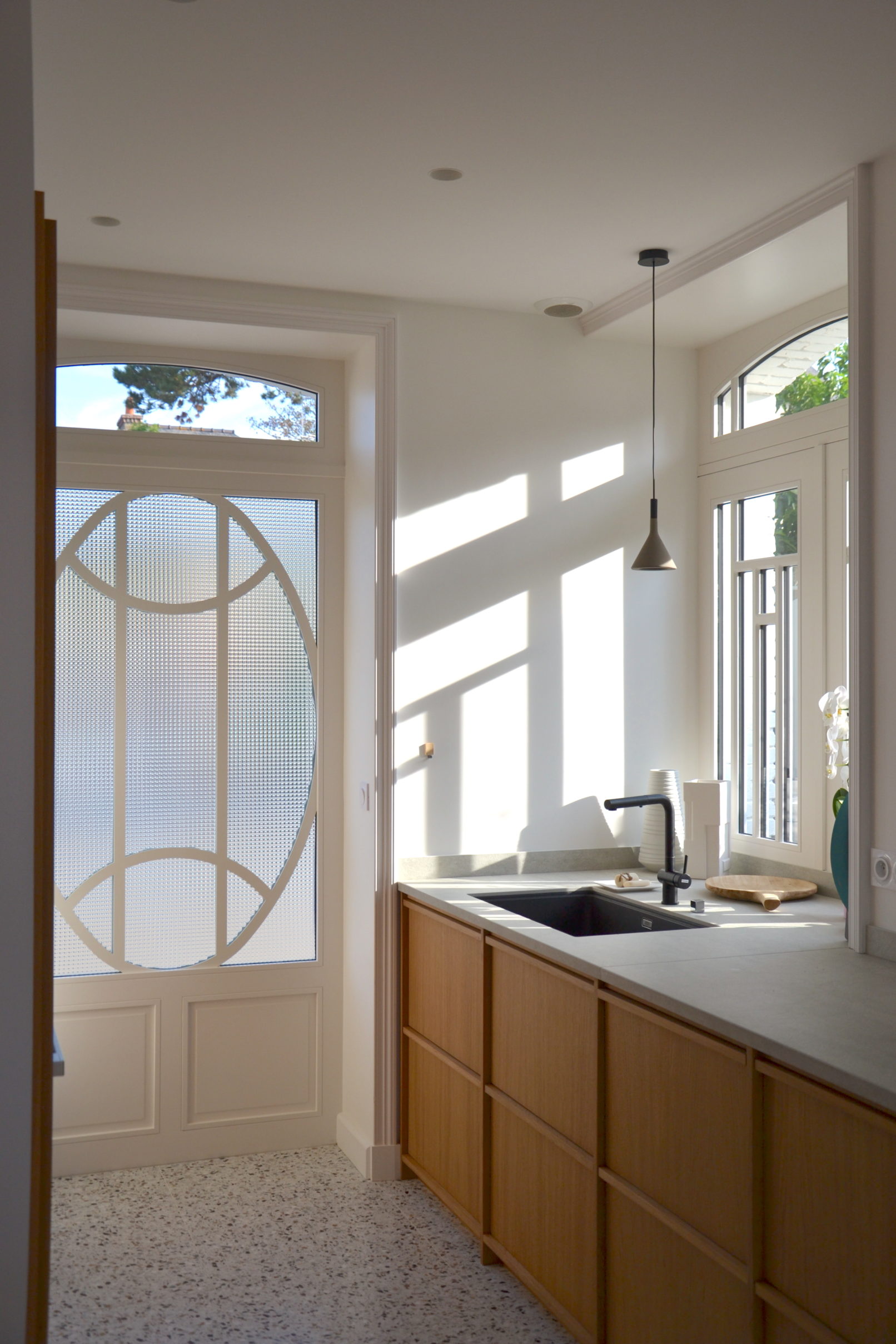 Les parquets dans les étages ont pu être préservés. Des carreaux de ciment du RDC ont été réemployés. Une porte en serrurerie intérieure, dont la forme s’inspire des menuiseries existantes, a été créer pour séparer le salon de l’espace technique, tout en gardant la lumière.