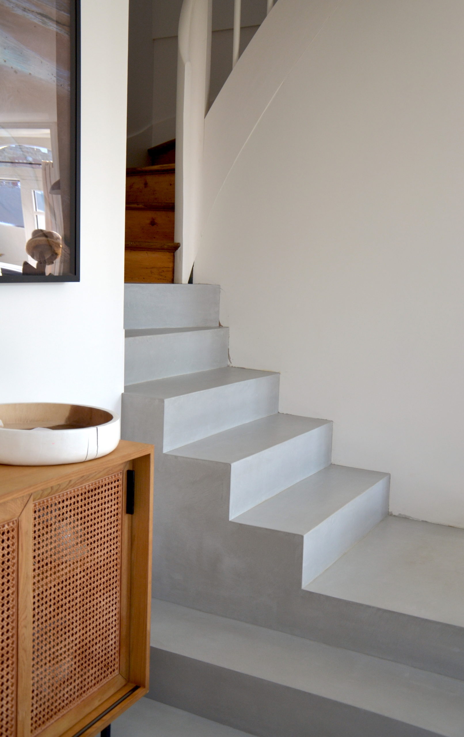 A l’intérieur, les volumes ont été modifiés. La pièce du rez-de-chaussée, à l’origine divisée, a été entièrement ouverte, l’escalier retravaillé avec un socle en béton en partie basse pour mieux l’insérer dans la pièce.