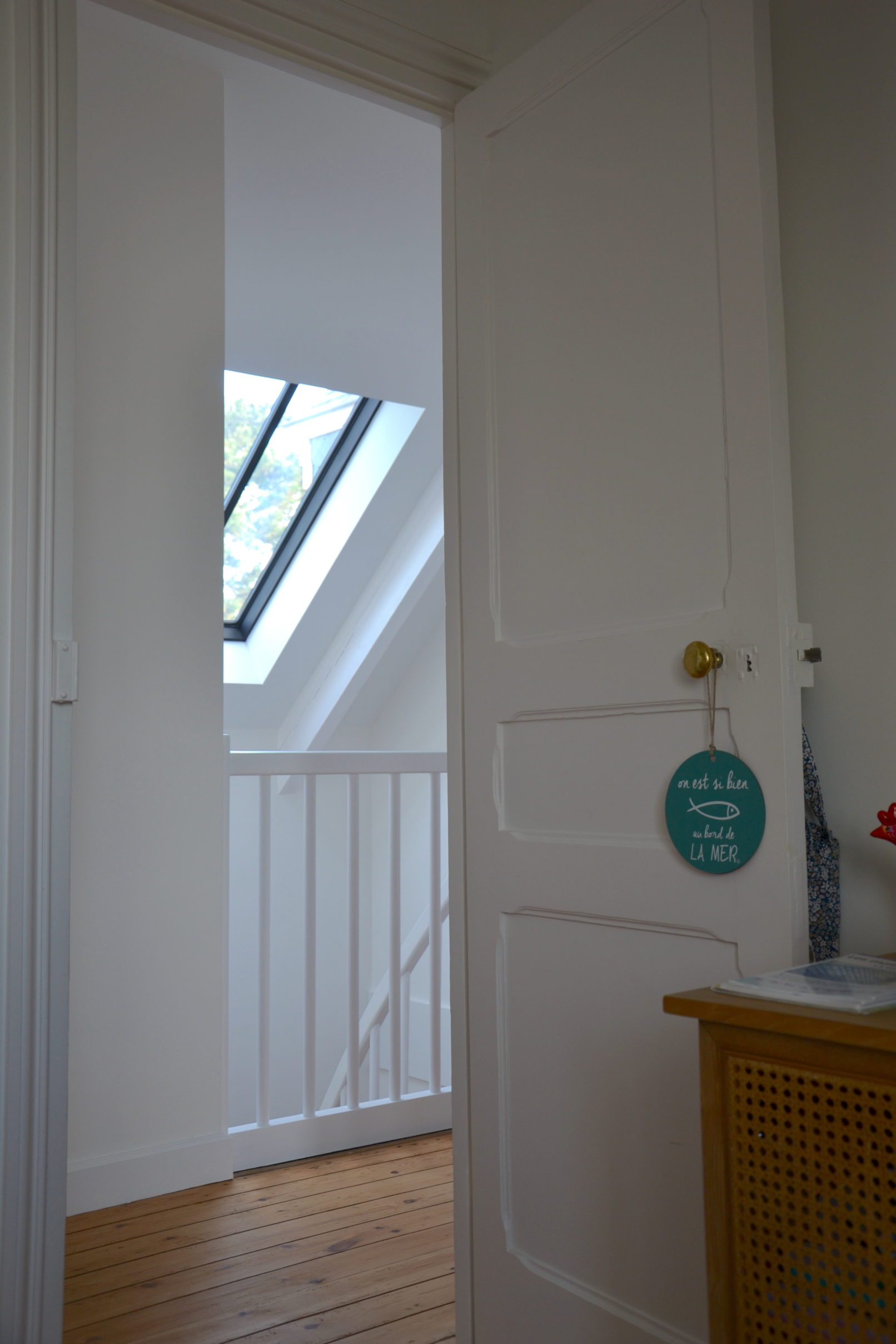 Au premier étage, deux chambres s’articulent autour d’un dressing, et d’une salle de bain. Au second étage, on trouve 3 chambres (distribution d’origine) et une salle de bain. Un soin a été apporté à l’éclairement. En effet, tous les espaces sont éclairés naturellement (verrière en toiture dans l’escalier, réemploi des menuiseries anciennes pour distribuer les pièces intérieures).