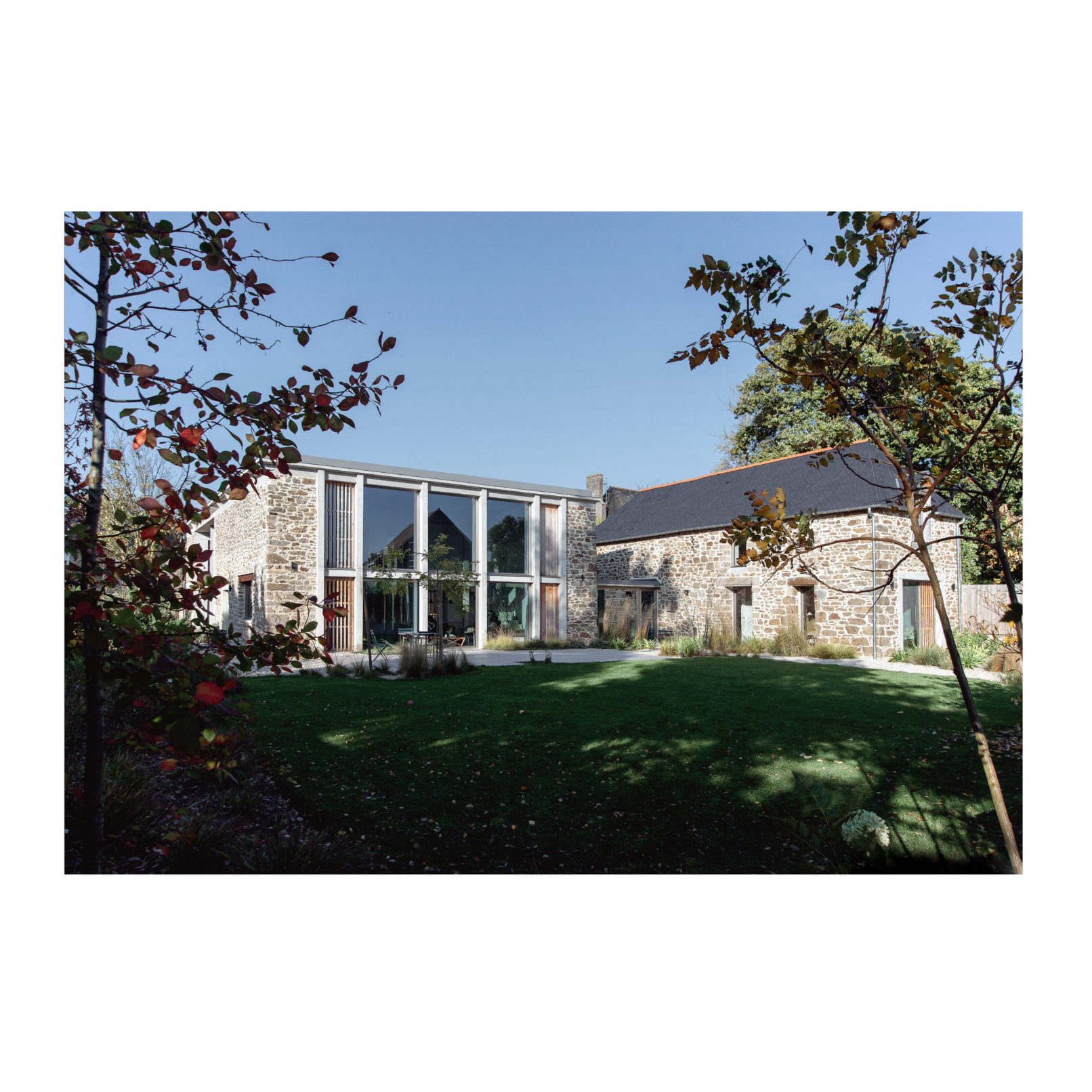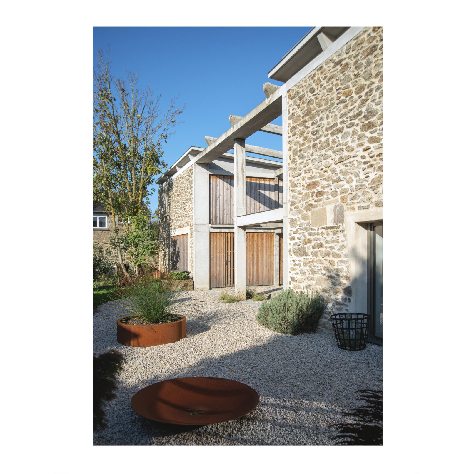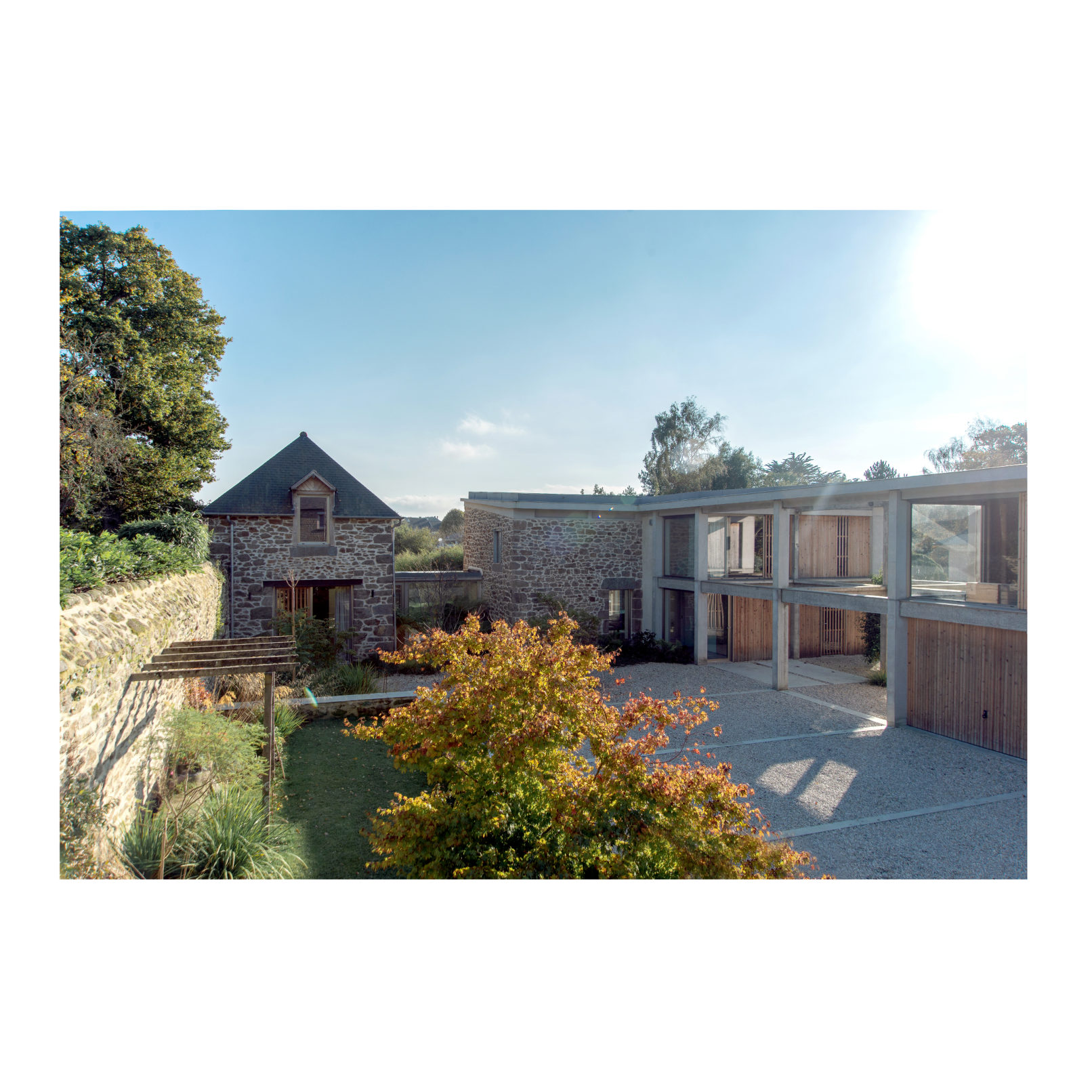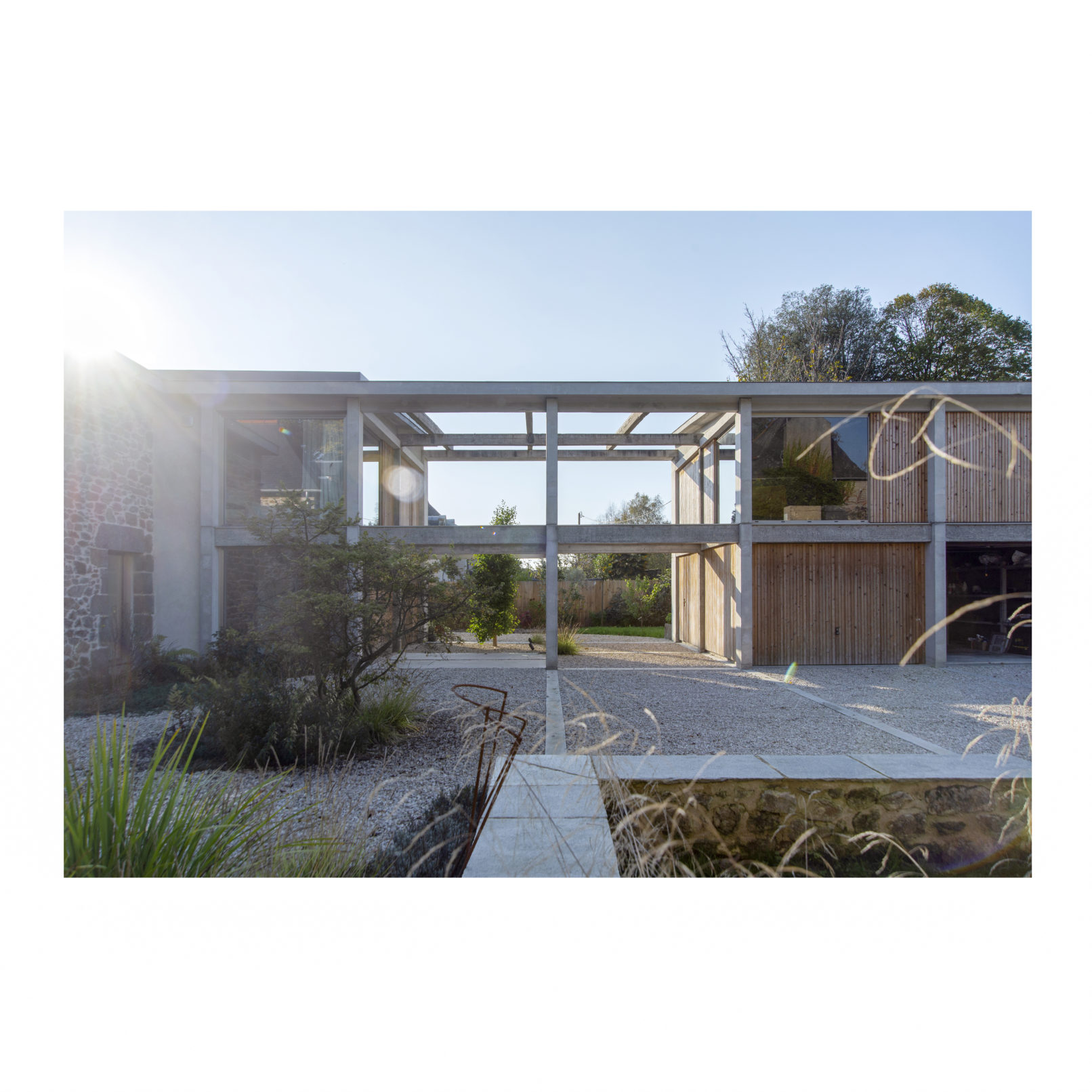 Défi relevé (Par chance ces 2 brestois aiment le béton!) et le projet nous permet d’accueillir leur résidence secondaire ou se rassemblera la famille. Les deux bâtiments permettent d’ailleurs de répondre au besoin d’une maison évolutive : l’emballage, d’une taille chaleureuse pour le couple, reçoit l’unité de vie principale. La grange accueille les 4 autres chambres, quand la famille se réunit. (Cette grange pourra devenir une unité autonome car le plan et les attentes sont pensées pour la faire évoluer). L’autre défi a été de conserver et révéler la structure en béton de l’emballage, composé d’une trame de poteaux/poutres très présente ainsi que des planchers et plafonds en béton. L’idée a été de mettre en avant cette structure et ainsi faire ressortir la colonne vertébrale du bâtiment, jusqu’à la prolonger sur les façades et ainsi créer une trame d’ouvertures, parfois vitrées, parfois bardées de bois. L’aménagement intérieur s’est ensuite construit autour de cette trame. La réunion des 2 bâtiments par un couloir vitrée entraîne une contrainte dans le fonctionnement des espaces extérieurs, qui ne communiquent plus. Ainsi, une partie de l’aile du bâtiment située sur la cour est évidée, la structure béton qu’on devinait derrière les façades et révélée et contribue au charme de l’ensemble.