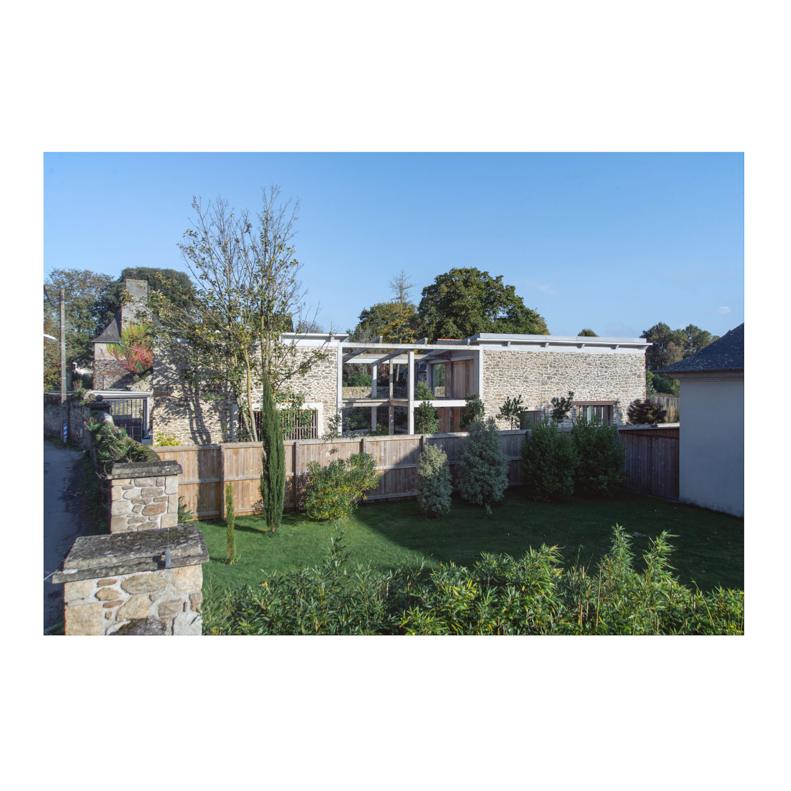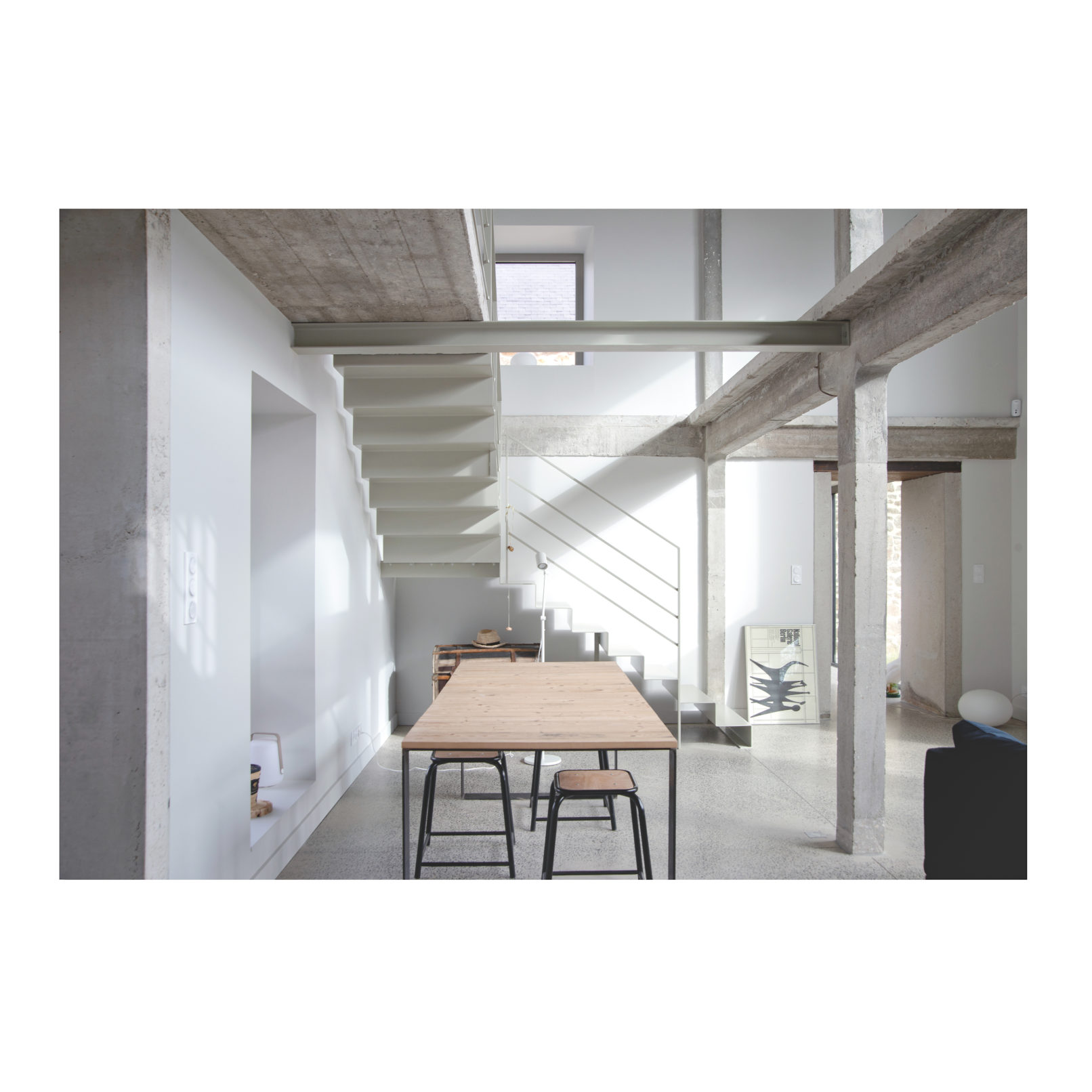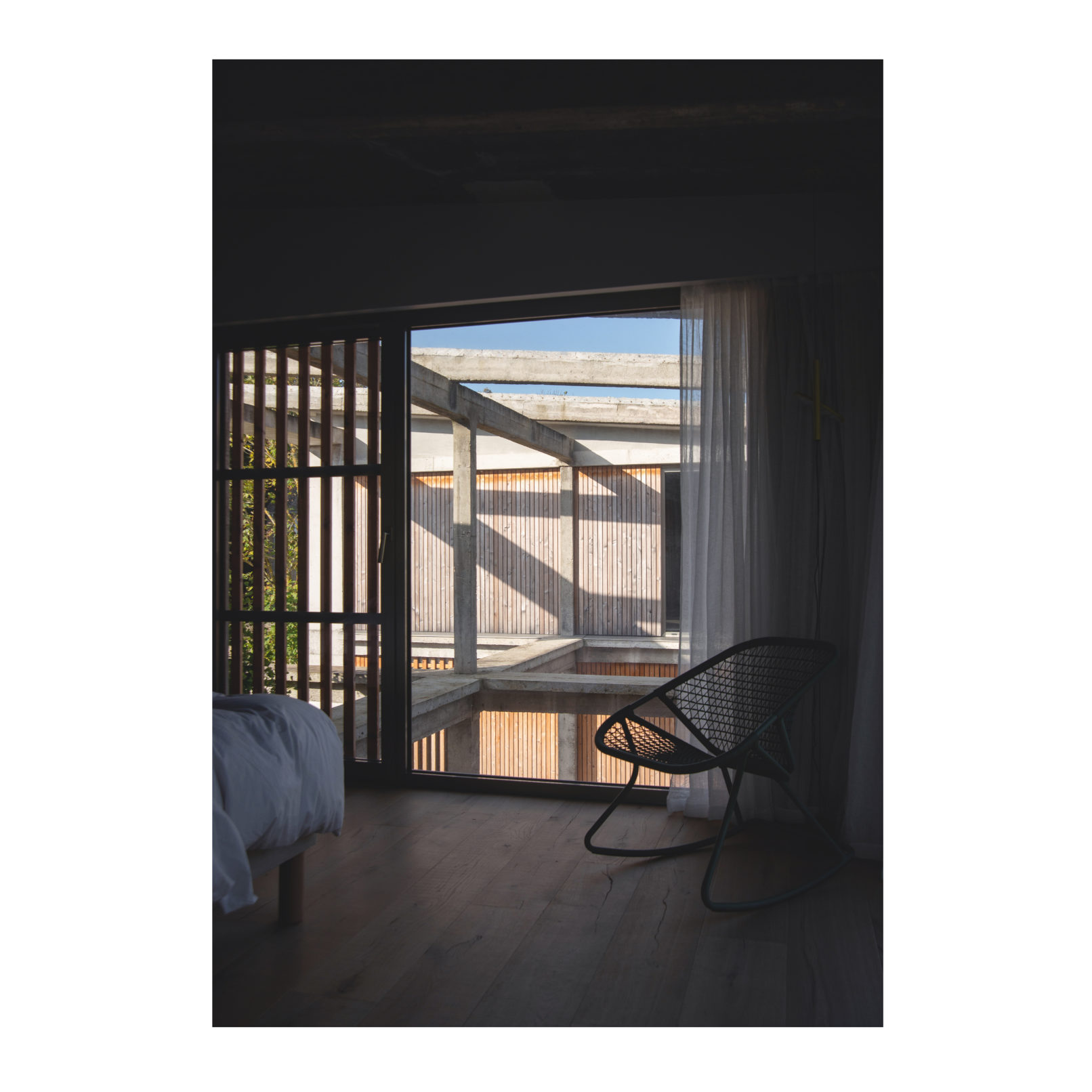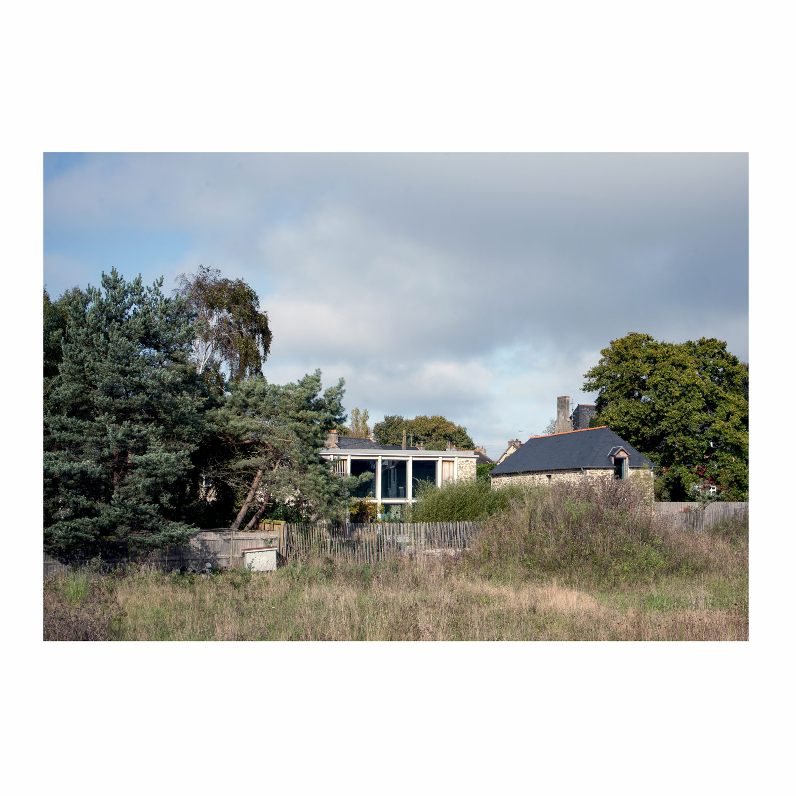 Défi relevé (Par chance ces 2 brestois aiment le béton!) et le projet nous permet d’accueillir leur résidence secondaire ou se rassemblera la famille. Les deux bâtiments permettent d’ailleurs de répondre au besoin d’une maison évolutive : l’emballage, d’une taille chaleureuse pour le couple, reçoit l’unité de vie principale. La grange accueille les 4 autres chambres, quand la famille se réunit. (Cette grange pourra devenir une unité autonome car le plan et les attentes sont pensées pour la faire évoluer). L’autre défi a été de conserver et révéler la structure en béton de l’emballage, composé d’une trame de poteaux/poutres très présente ainsi que des planchers et plafonds en béton. L’idée a été de mettre en avant cette structure et ainsi faire ressortir la colonne vertébrale du bâtiment, jusqu’à la prolonger sur les façades et ainsi créer une trame d’ouvertures, parfois vitrées, parfois bardées de bois. L’aménagement intérieur s’est ensuite construit autour de cette trame. La réunion des 2 bâtiments par un couloir vitrée entraîne une contrainte dans le fonctionnement des espaces extérieurs, qui ne communiquent plus. Ainsi, une partie de l’aile du bâtiment située sur la cour est évidée, la structure béton qu’on devinait derrière les façades et révélée et contribue au charme de l’ensemble.