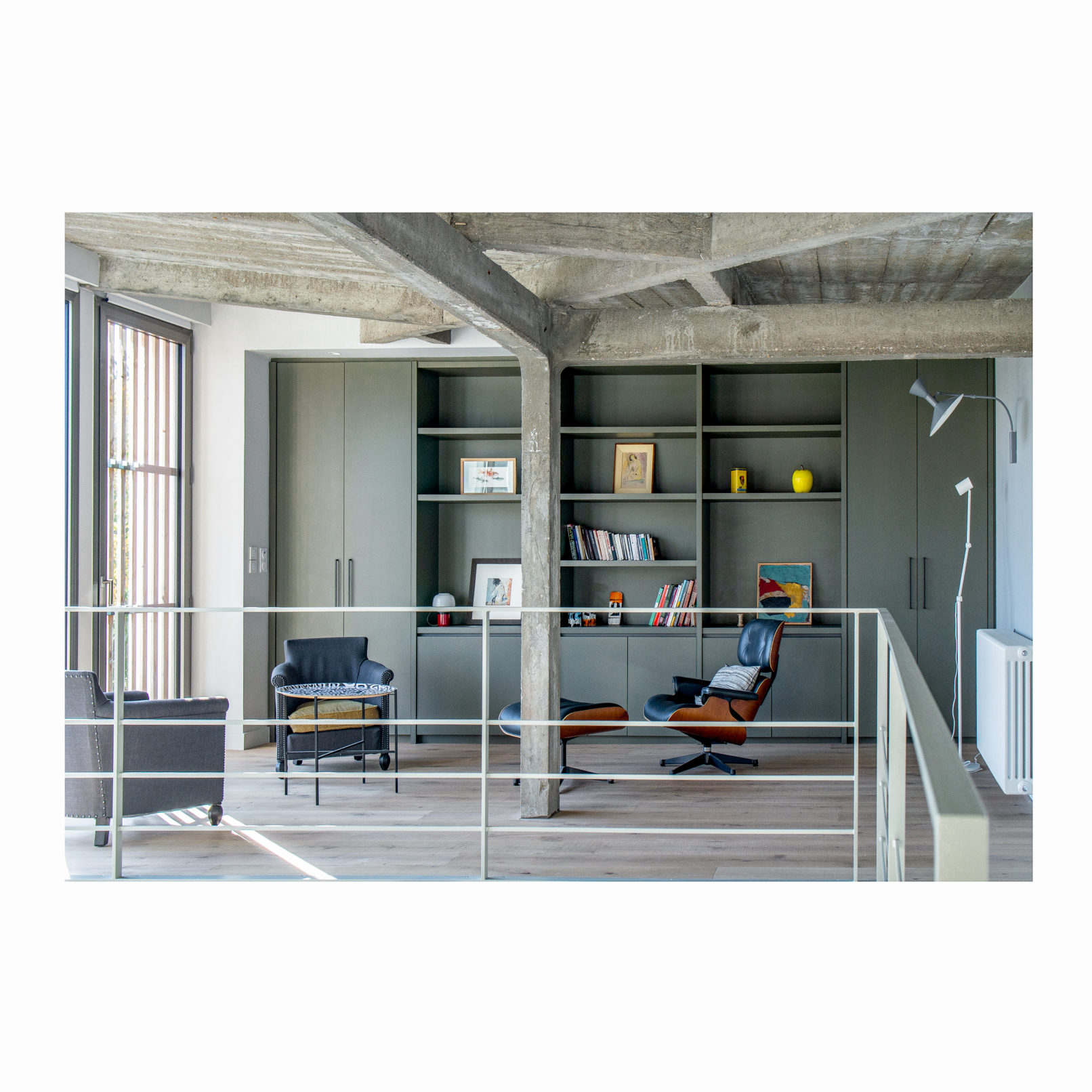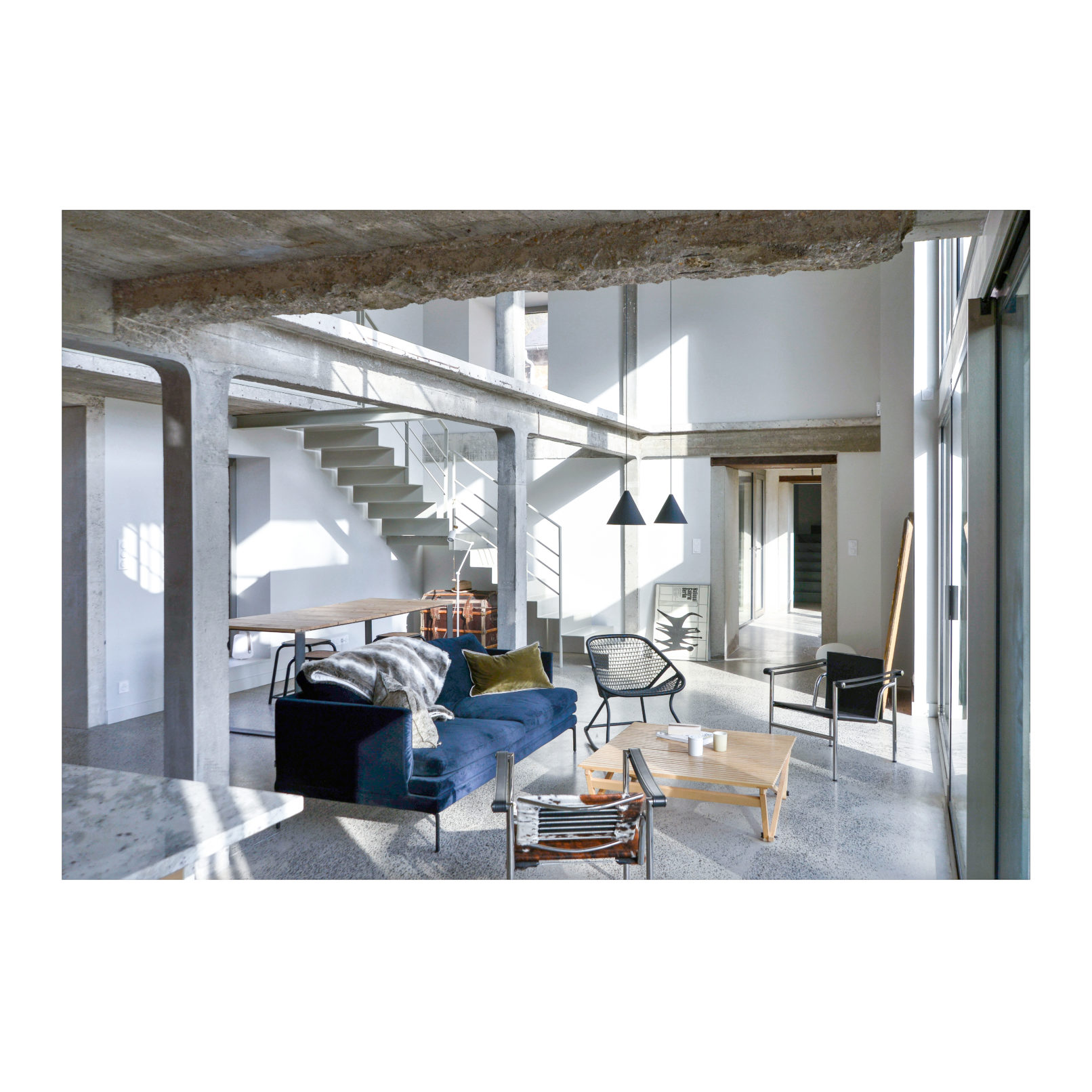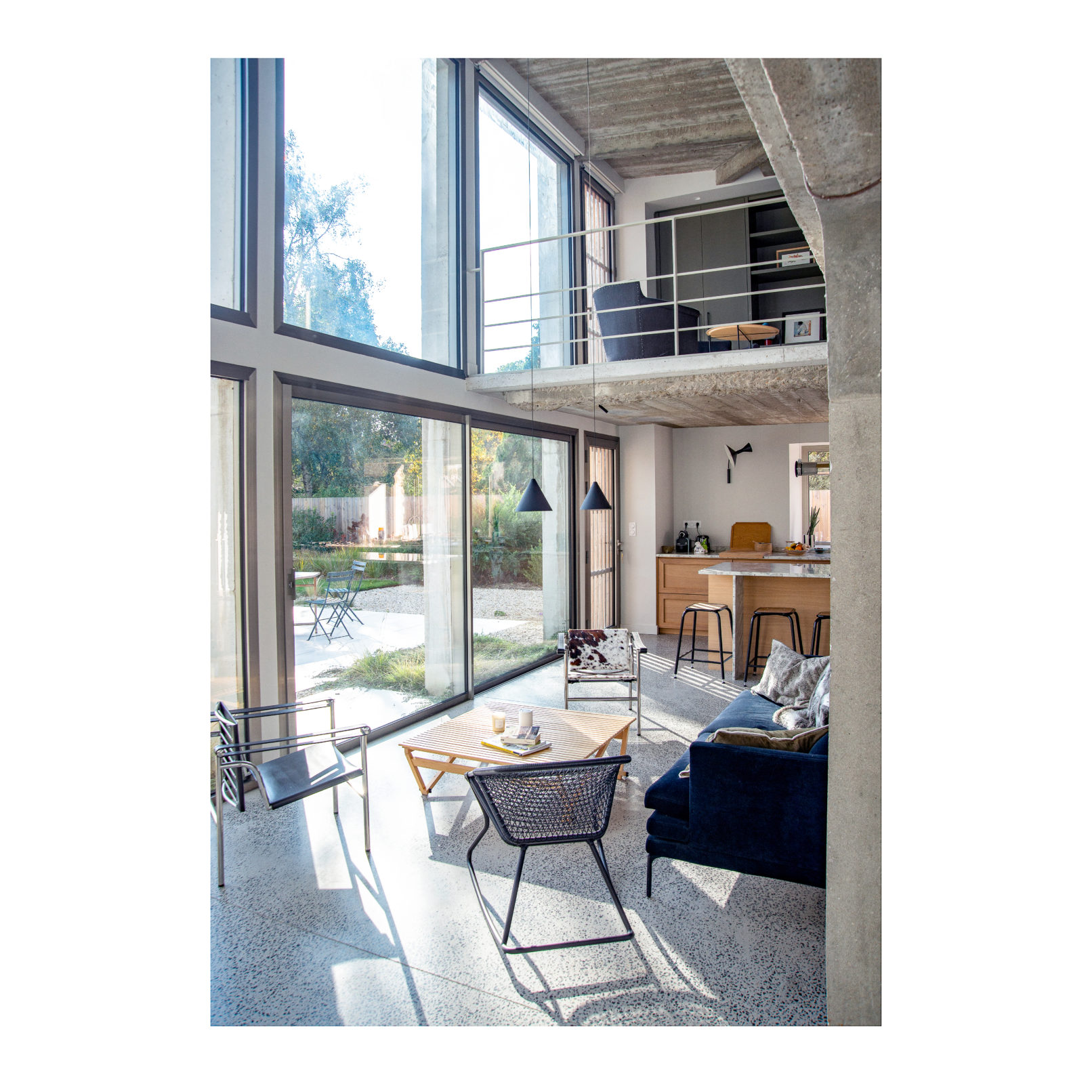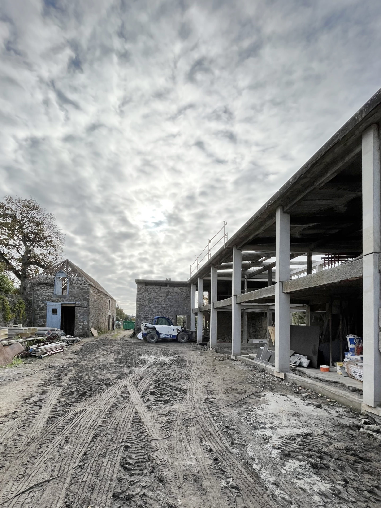Défi relevé (Par chance ces 2 brestois aiment le béton!) et le projet nous permet d’accueillir leur résidence secondaire ou se rassemblera la famille. Les deux bâtiments permettent d’ailleurs de répondre au besoin d’une maison évolutive : l’emballage, d’une taille chaleureuse pour le couple, reçoit l’unité de vie principale. La grange accueille les 4 autres chambres, quand la famille se réunit. (Cette grange pourra devenir une unité autonome car le plan et les attentes sont pensées pour la faire évoluer). L’autre défi a été de conserver et révéler la structure en béton de l’emballage, composé d’une trame de poteaux/poutres très présente ainsi que des planchers et plafonds en béton. L’idée a été de mettre en avant cette structure et ainsi faire ressortir la colonne vertébrale du bâtiment, jusqu’à la prolonger sur les façades et ainsi créer une trame d’ouvertures, parfois vitrées, parfois bardées de bois. L’aménagement intérieur s’est ensuite construit autour de cette trame. La réunion des 2 bâtiments par un couloir vitrée entraîne une contrainte dans le fonctionnement des espaces extérieurs, qui ne communiquent plus. Ainsi, une partie de l’aile du bâtiment située sur la cour est évidée, la structure béton qu’on devinait derrière les façades et révélée et contribue au charme de l’ensemble.