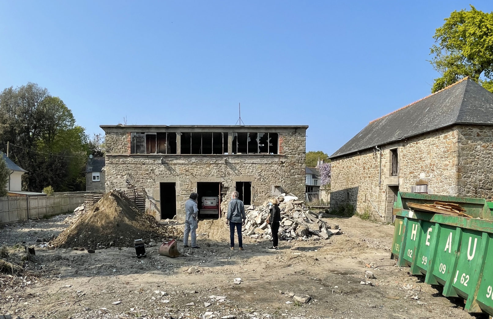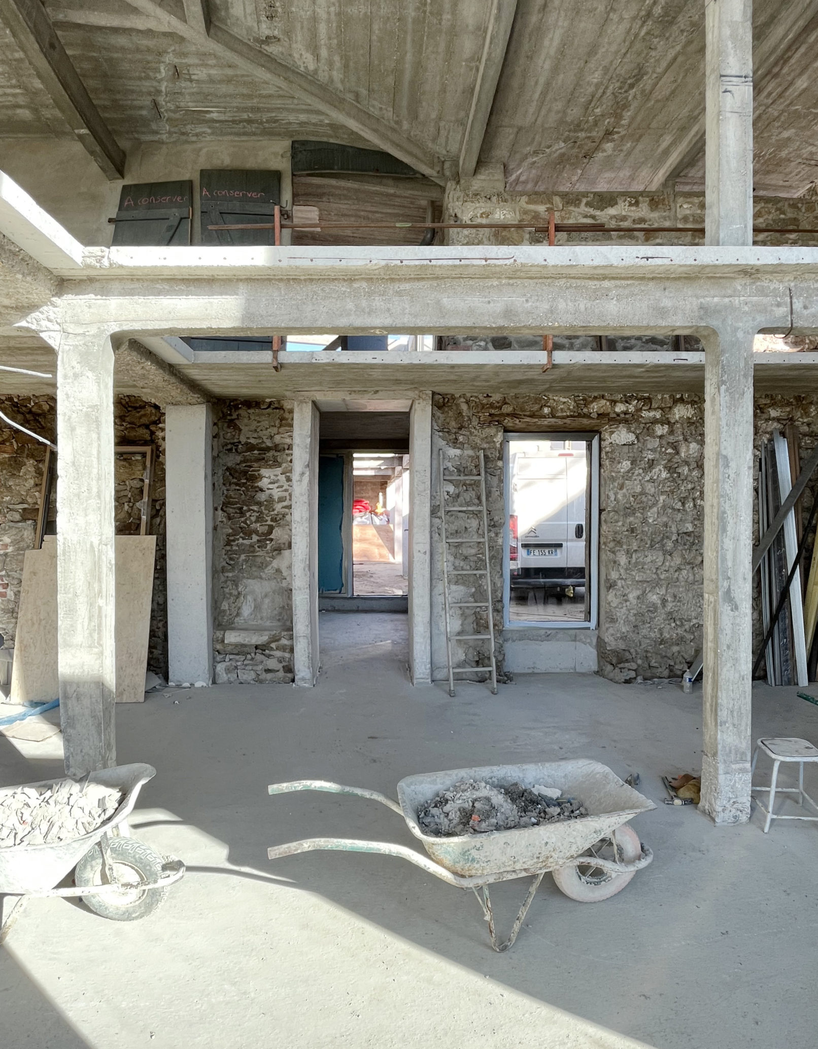 Contactée pour la réalisation d’une « petite extension », je pousse le portail sur lequel est cloué un permis de démolir pour pénétrer un site incroyable. Une grande cour dans laquelle se confronte une grange en pierre coiffée d’une toiture en ardoise avec, en face, ce qu’on appellera « l’emballage », bâtiment de 2 étages, toiture terrasse, mi enduit, mi pierre, dont on devine la structure en béton qui date de 1922, objet de la démolition ! Ne pas démolir apparaît comme une évidence. Faire changer d’avis Françoise et Jacques, récents propriétaires du lieu, un défi.