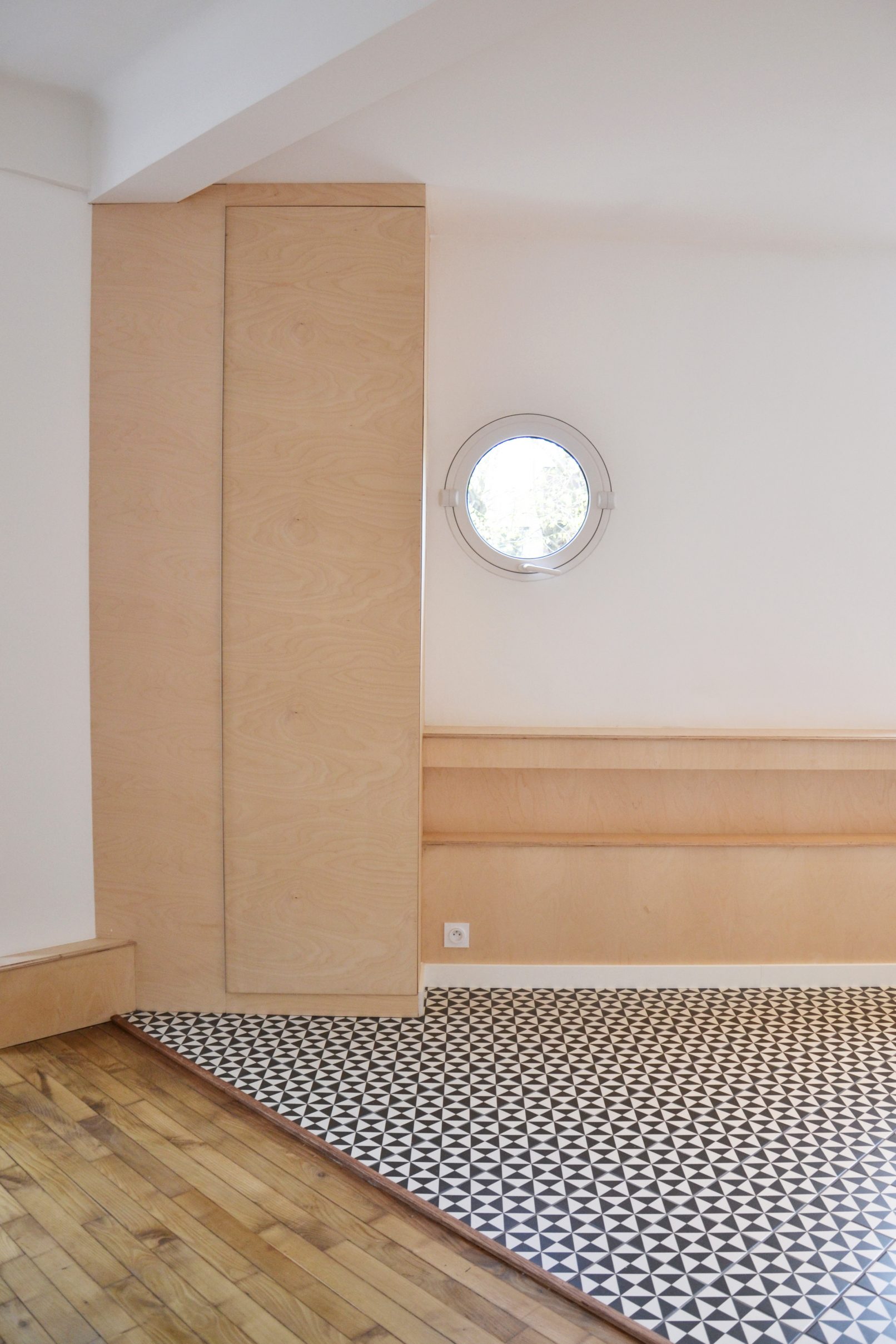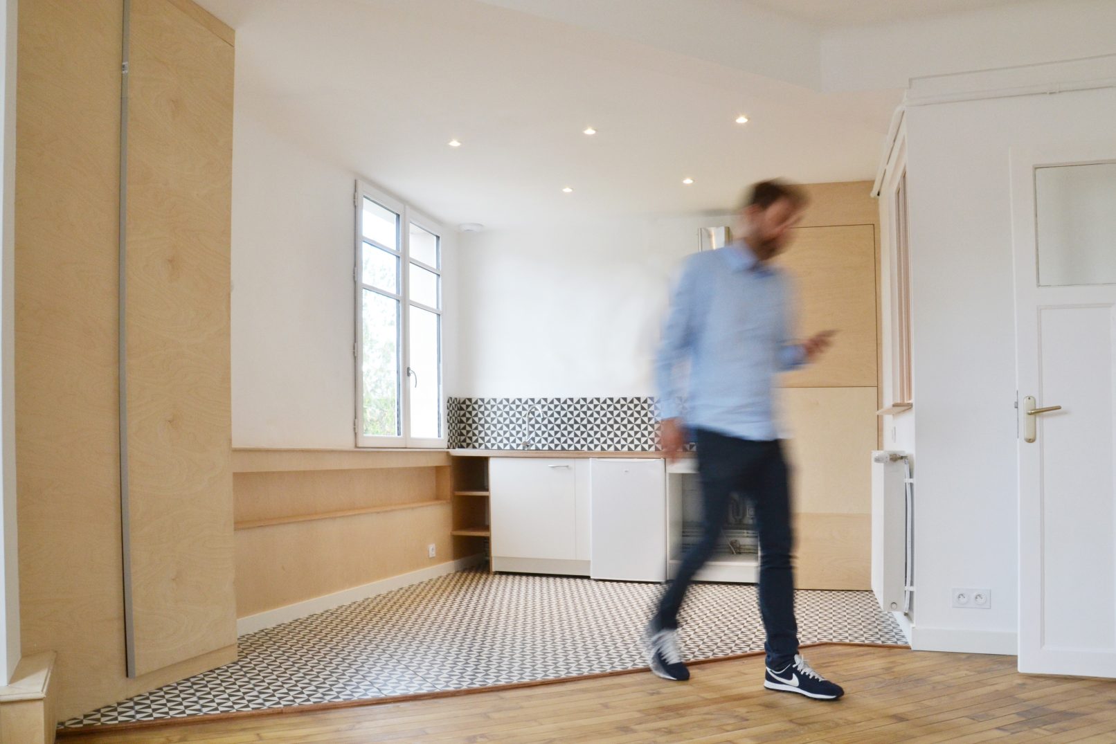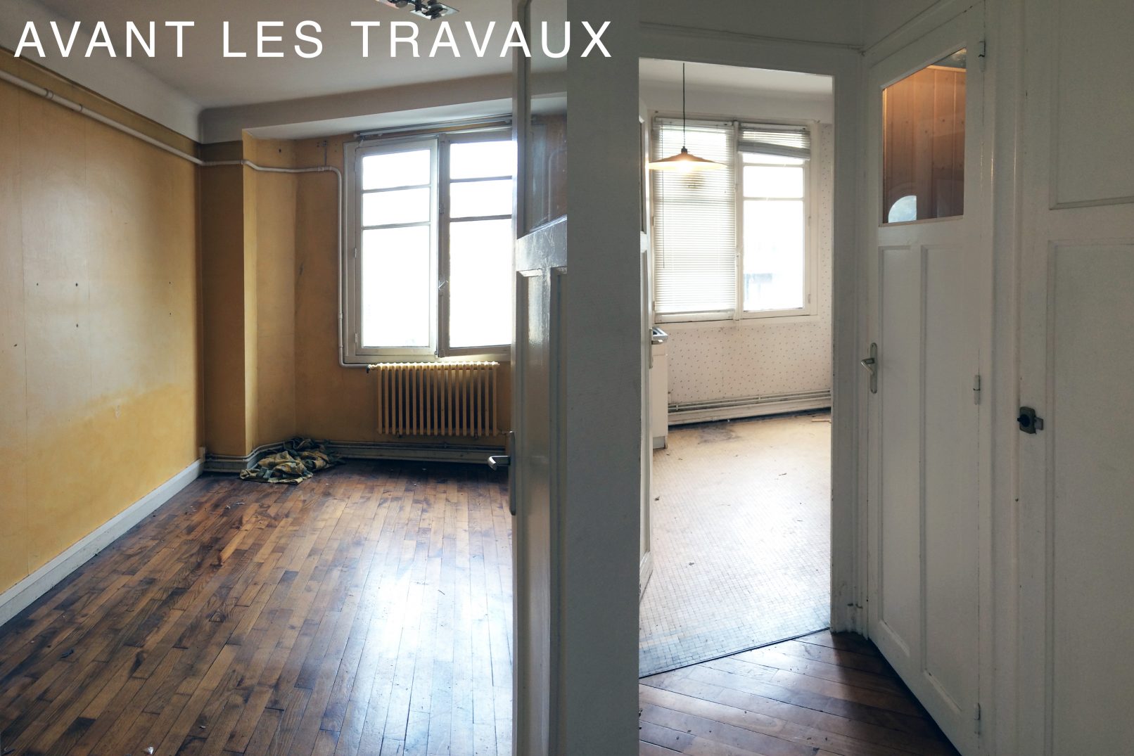 Un appartement desservi en étoile, 3 pièces de dimension équivalentes sans qualité, des années sans voir un pinceau de peinture.  Le projet consistera à ouvrir la piece de vie, créer de l’espace, donner une qualité aux pieces existantes, créer de nombreux rangements. C’est une rénovation « petit budget » (Surface 45 m2 / Budget 30000 € ), pour laquelle il a fallu se montrer astucieux car tous les postes ont été impactés par la rénovation.